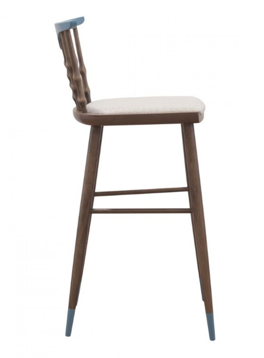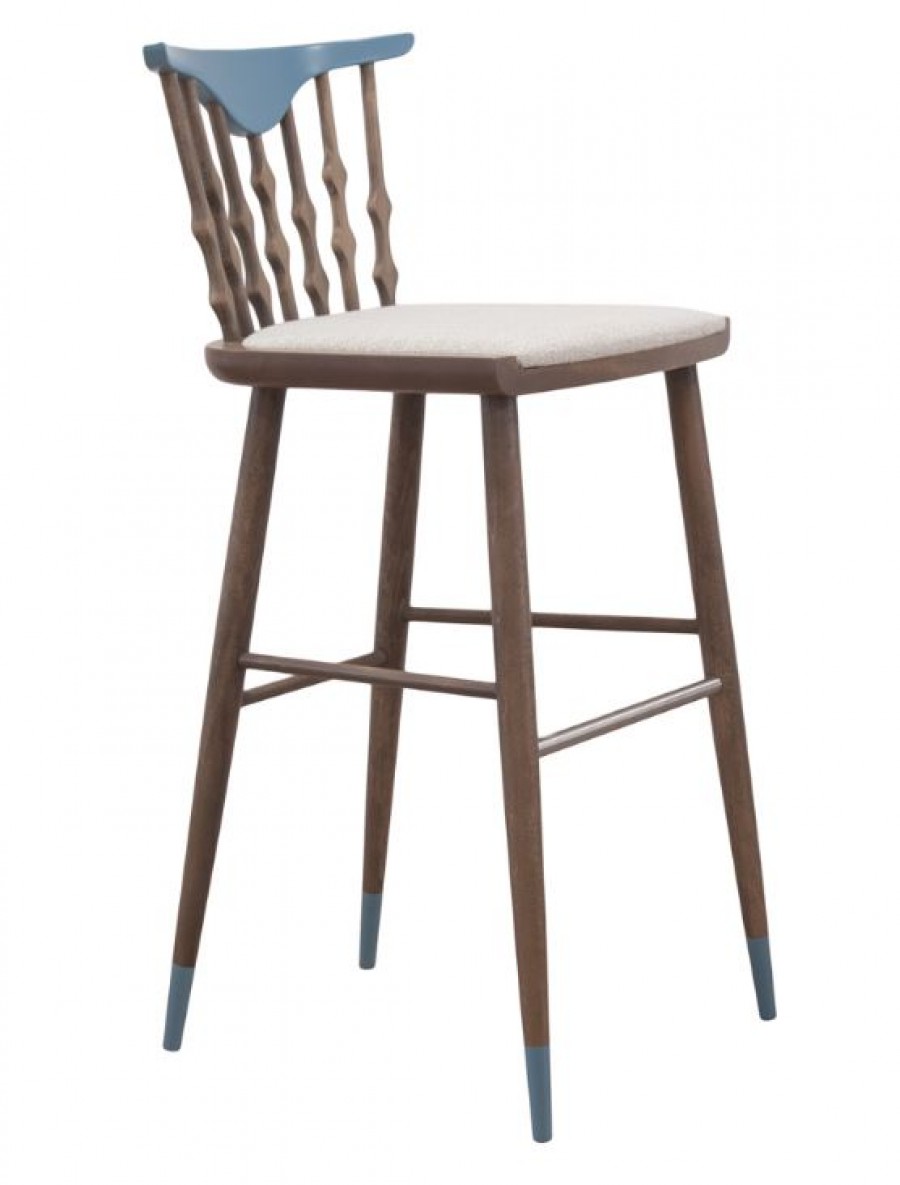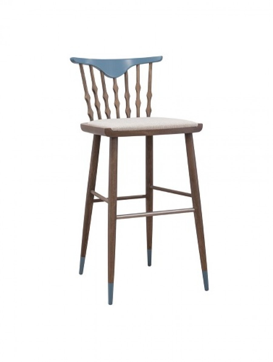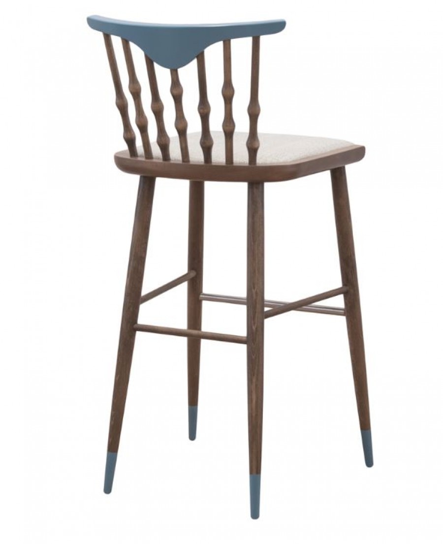 EDITION Ajax Bar Stool / Beech Frame Standard / Additional Wood Stain Finishes Available / Fully Upholstered Seat / In A Wide Choice Of Fabric Options / Wooden Tapered Legs / On Glides / Braced On Sides For Added Strength / Generous Seating Proportions / Unique Rodded Back Detailing / Top Of Back And Tips Of Legs Are Available In Various Colour Options / Integrated Foot Rest / Ideal for Coffee Shops and Restaurants