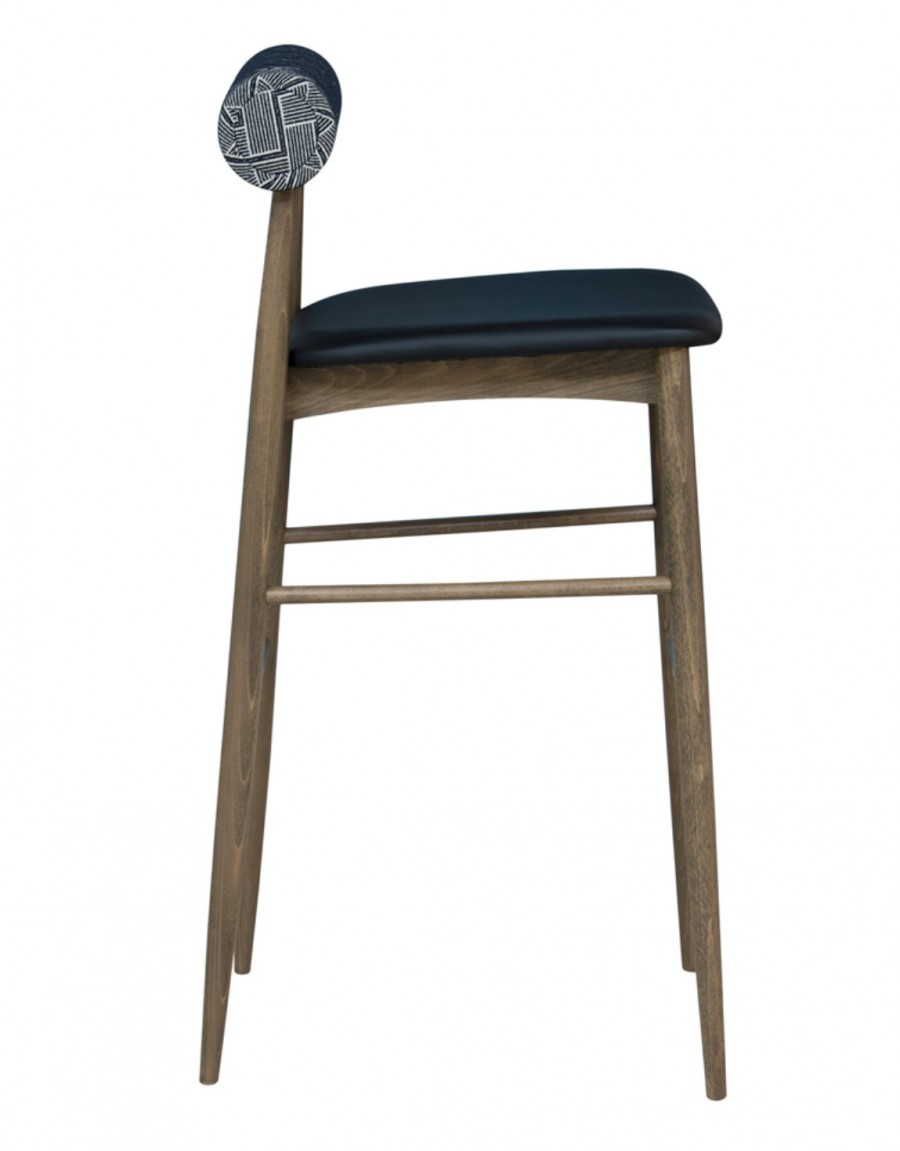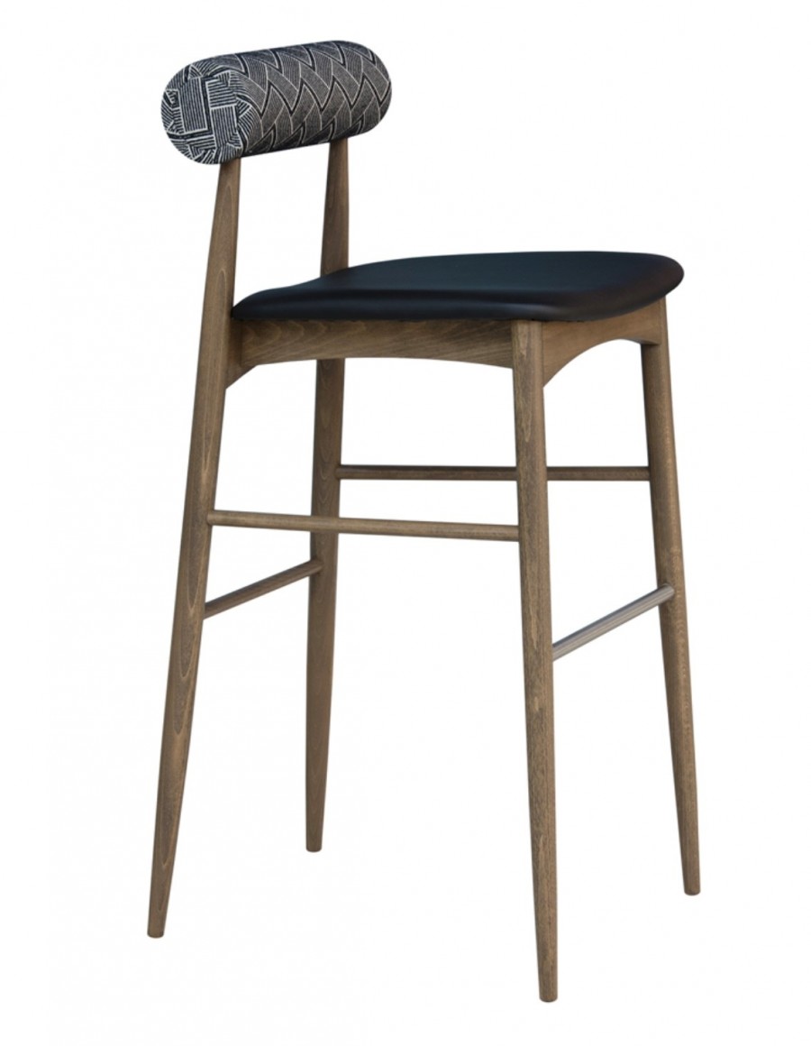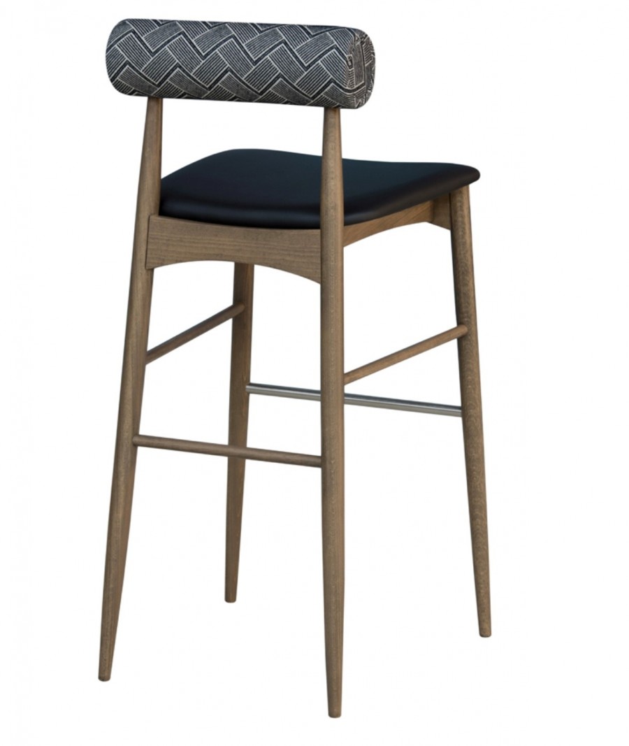 EDITION Comox Bar Stool / Beech Wood Frame Standard / Upcharge For Various Wood Stain Finishes / Tapered Legs On Glides For Added Detail / Exposed Frame Detailing / Integrated Foot Rest / Upholstered Seat Standard / Various Leathers And Fabric Finishes / Fully Upholstered Log Back Rest / Ideal for Hotels and Restaurants