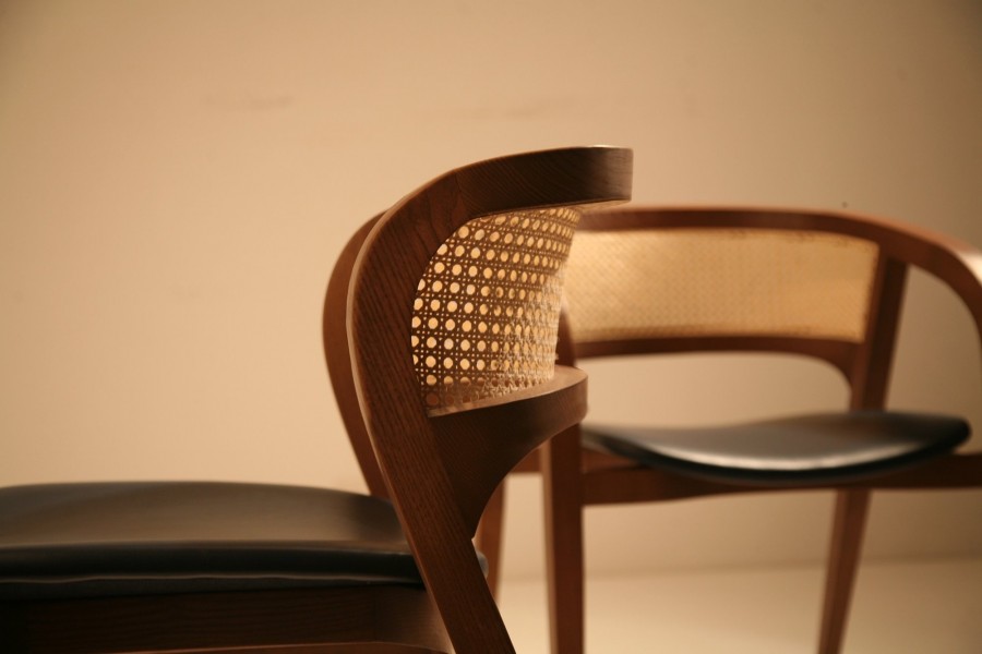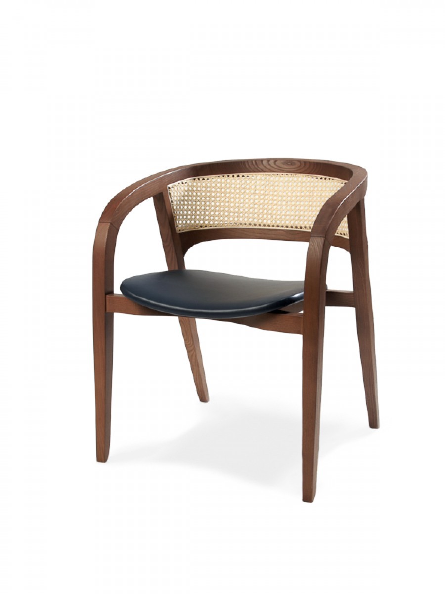 EDITION Hanwell Arm Chair / Ash Frame Standard / Additional Wood Stain Finishes Available / Integrated Arms / Upholstered Seat Standard / Natural Cane Curved Back Standard / Braced For Heavy Contract Use / Ideal for Hotels and Restaurants