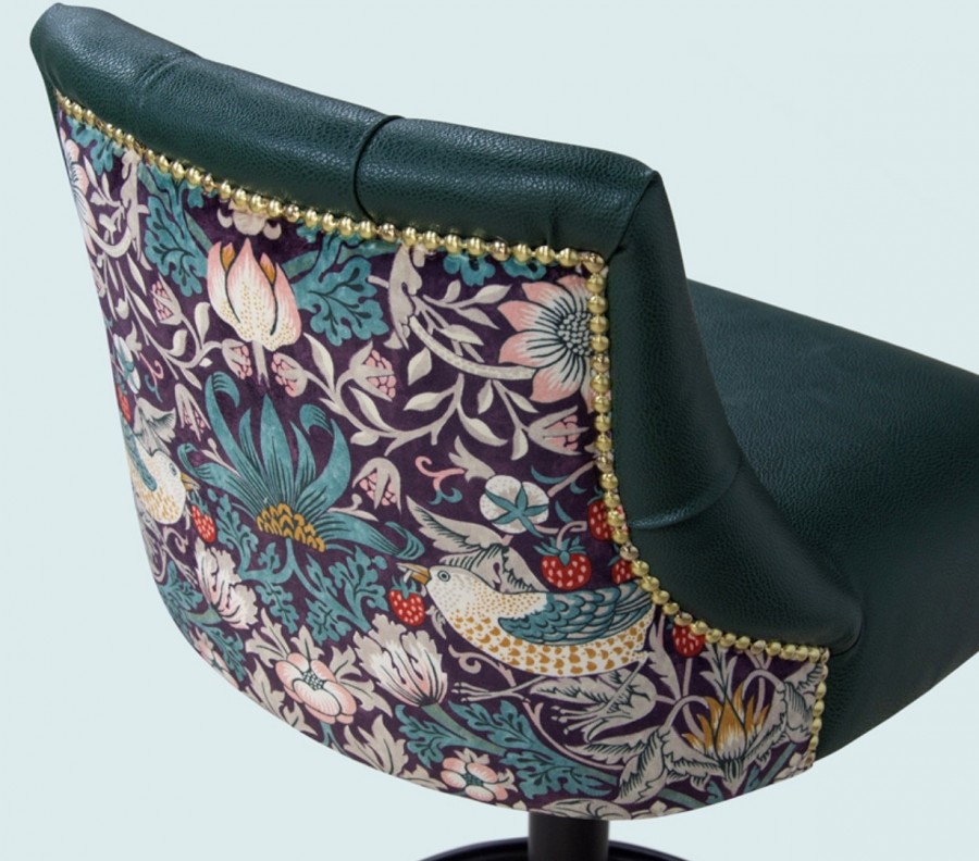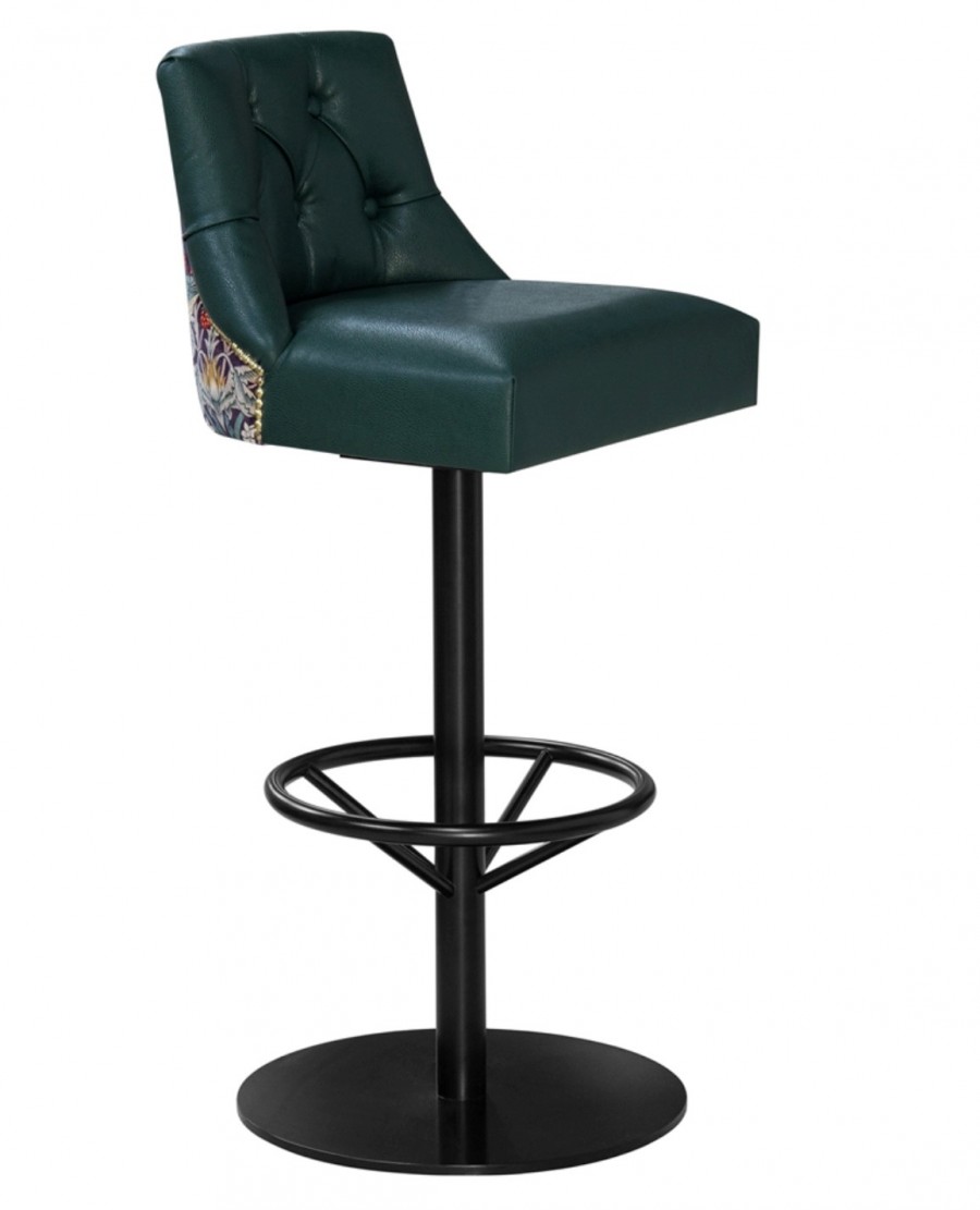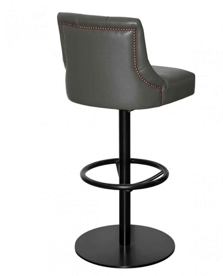 EDITION Prescot Disc Bar Stool / Black Painted Swivel Disc Base / Integrated Foot Rest / Upholstered Seat And Back Standard / Well Padded Seating / Various Leathers And Fabric Finishes / Buttoned Inner Back For Added Detail / Upcharge for Brass Nail Head Detailing On Outside Of Shell / Outer backs can be customised with nail heads and two-tone upholstery to suit your interior space / Ideal for Hotels and Restaurants.