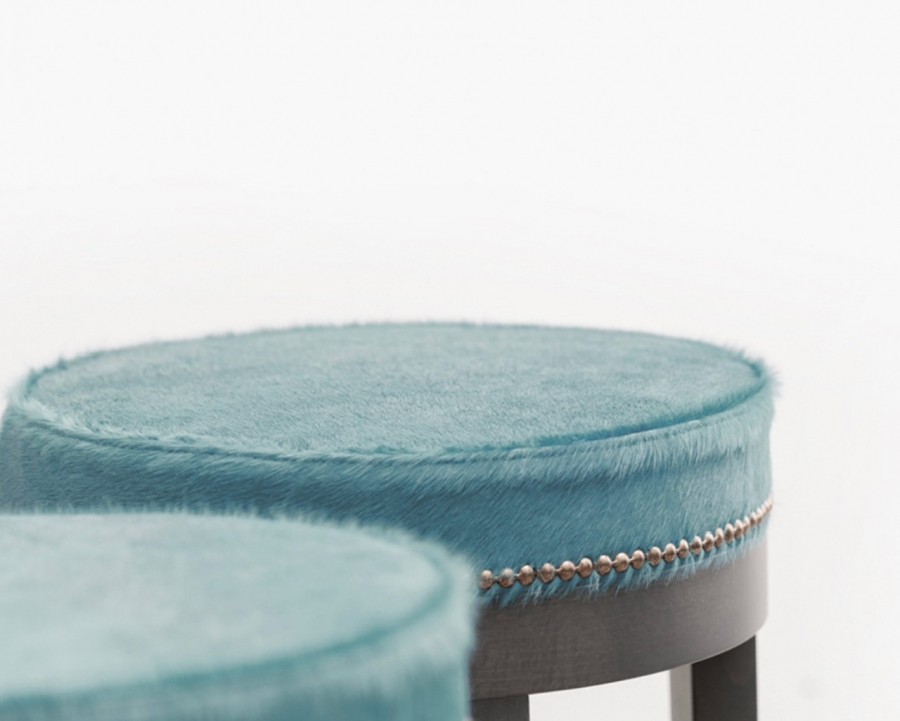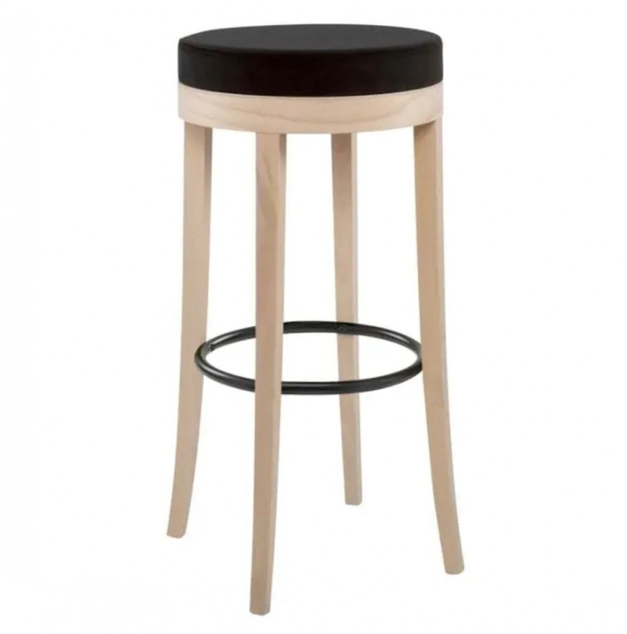 Bazin Stool / Available in counter or bar height / Beech wooden frame standard / Upcharge for additional wood stain finishes / Tapered wooden legs on nylon glides / Black painted footrest standard / Upcharge for brass footrest / Fully upholstered seat / Can be upholstered in fabric, vinyl or leather / Upcharge for nail head detail around seat available in silver or brass finish / Ideal for all restaurants and cocktail bars.