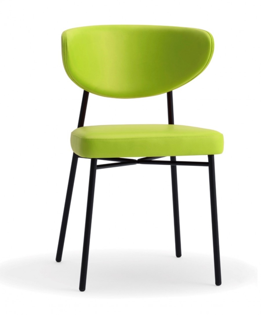 4 Legged Chair On Nylon Glides / Fully Upholstered Seat And Back / Round Tubular Frame / Wide Choice Of Painted Colour Options / Legs Run Up Back For Added Detail / Braced Under Seat For Added Strength And Detail / Can Be Upholstered In Fabric Vinyl Or Leather In a Wide Choice Of Options / Wrap Around Back For Added Comfort / Upcharge For Brass Ferrules On Legs / Upcharge For Button In Back / Ideal For All Restaurants, Bar Areas And Casinos