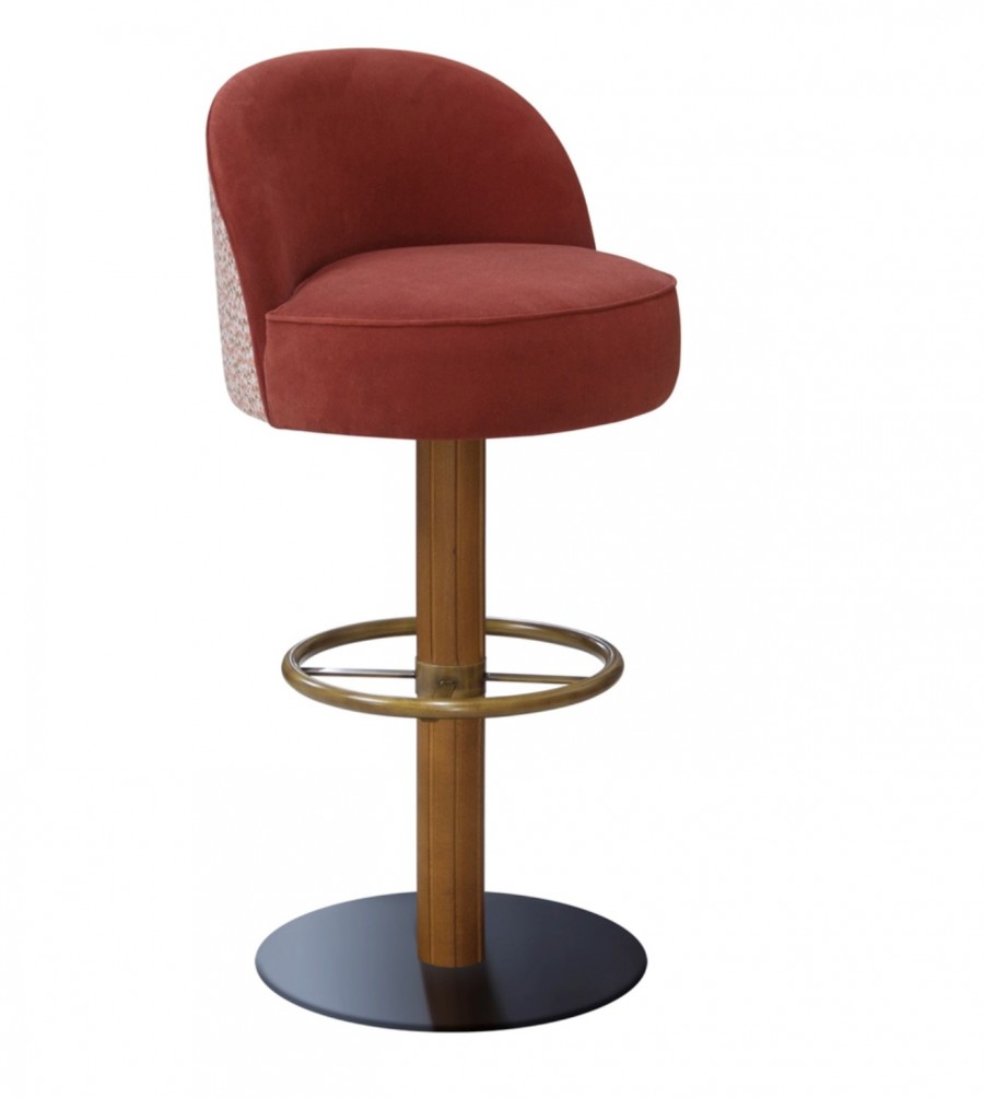 Dolomite Stool / Counter and bar height available / Well padded seat with curved back / Can be upholstered in fabric, vinyl or leather / Upcharge for two-tone upholstery / Centre column in beech finish standard / Grooves in column for added detail / Upcharge for additional wood stain finishes / Round tube footrest ring brass finish standard / Well weighted black disc base on floor for heavy contract use / Swivel mechanism with return / Ideal for bars, casinos, country clubs, sports stadiums and restaurants.