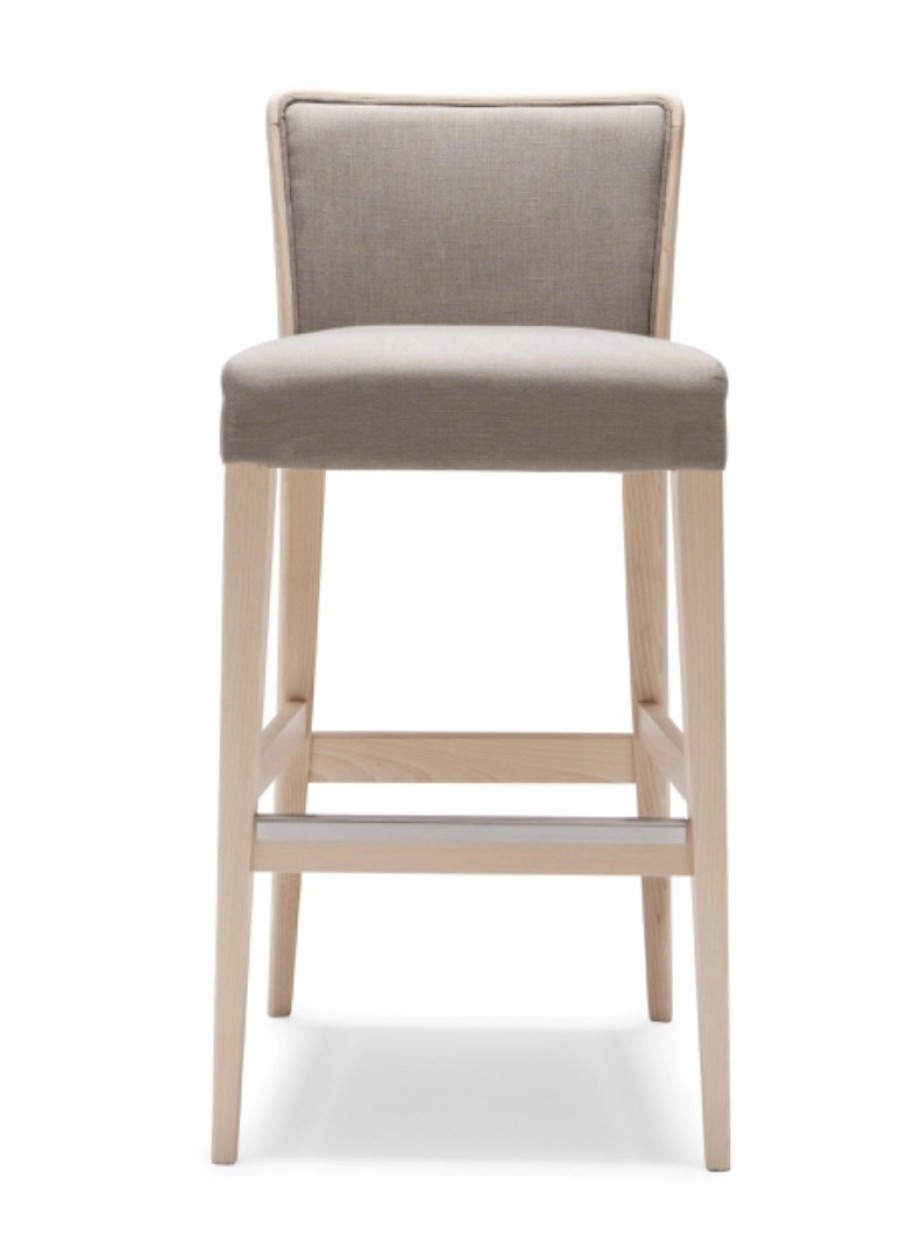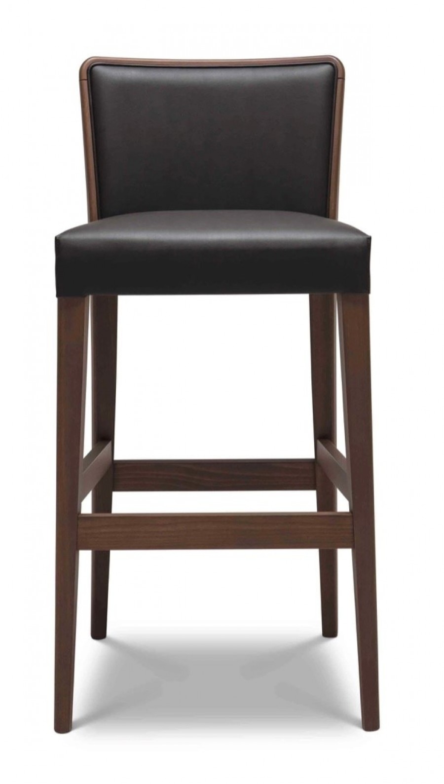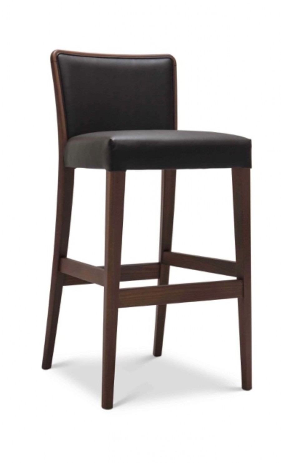 Doya Barstool / Beech frame standard / Upcharge for additional wood stain finishes / Wooden tapered legs / Braced all round for heavy contract use / Metal protected footrest / Wooden capping around outer back for added detail / Nylon glides / Fully upholstered / Well padded seat / Inner and outer back with piped edge for added detail / Available in fabric, vinyl or leather / Ideal for restaurants, bars, country clubs and casinos.