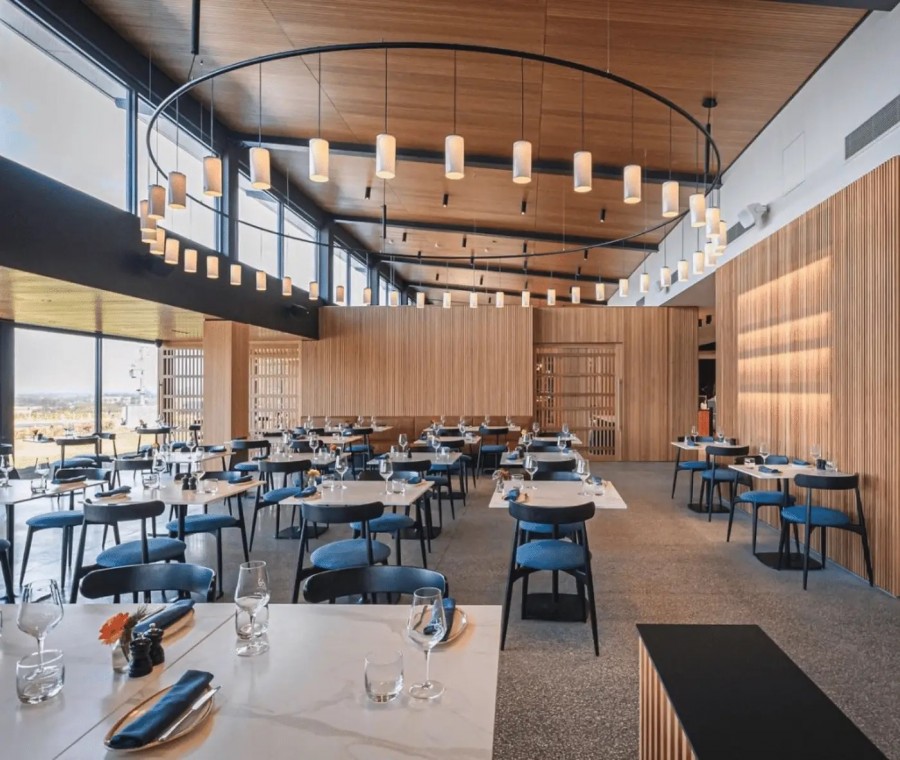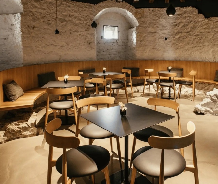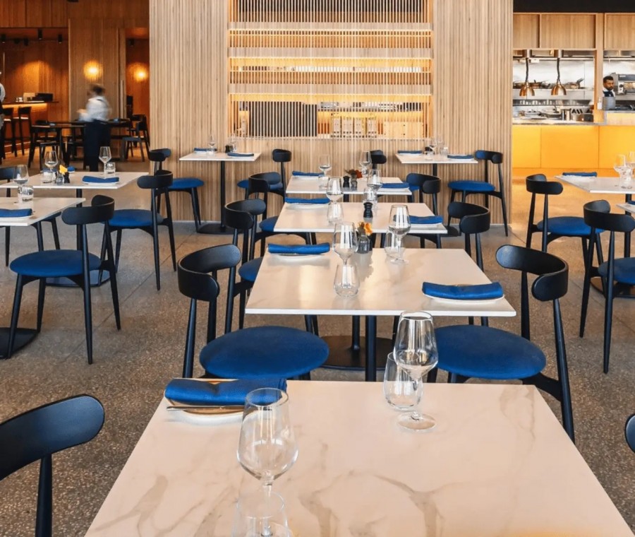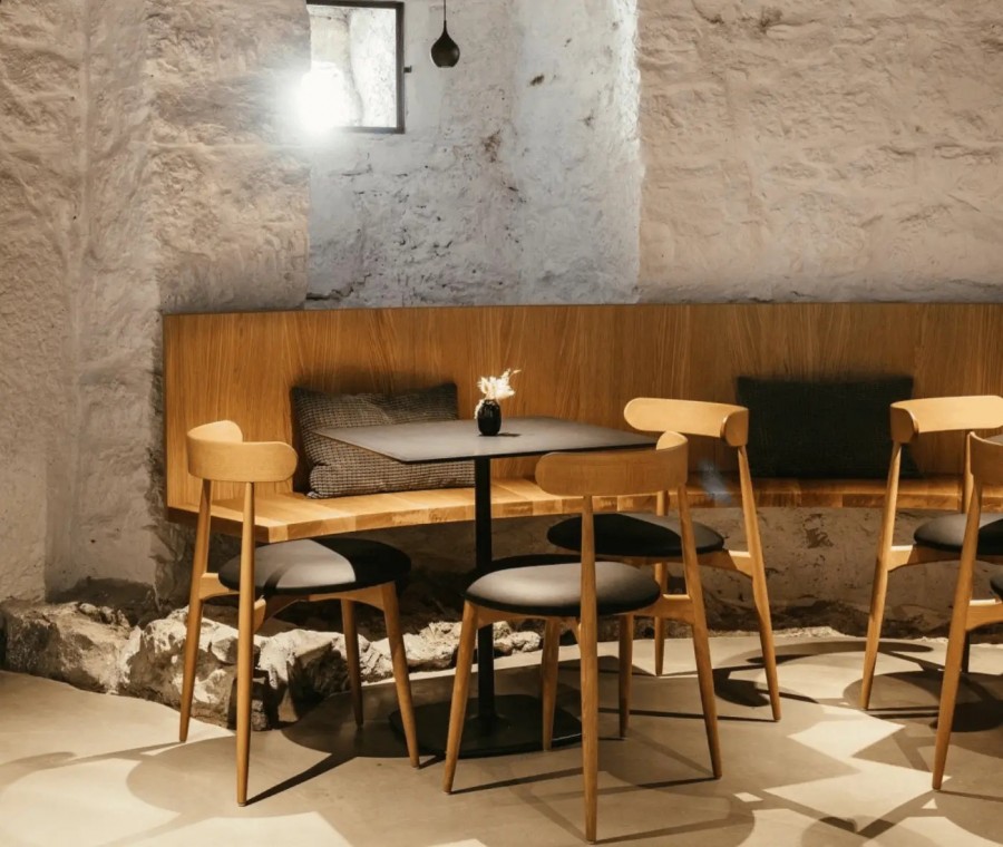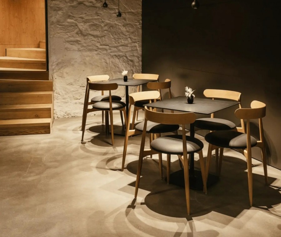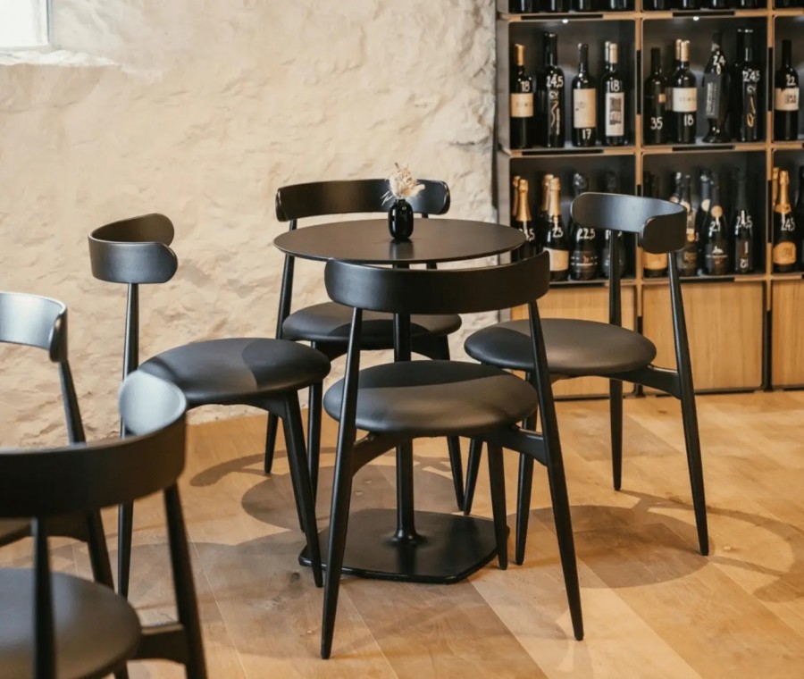 Area EDITION Frisbee Side Chair / Beech Frame Standard / Additional wood stain finishes available / Tapered wooden legs / Fully Upholstered Seat / Brace Under Seat for Added Strength / Plywood curved back / Nylon glides / Stackable 4-5 high on floor / Ideal for hotels, restaurants and coffee shops.