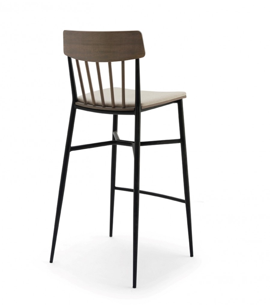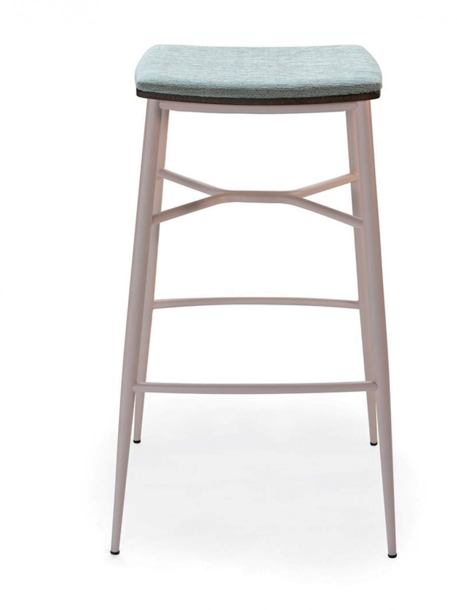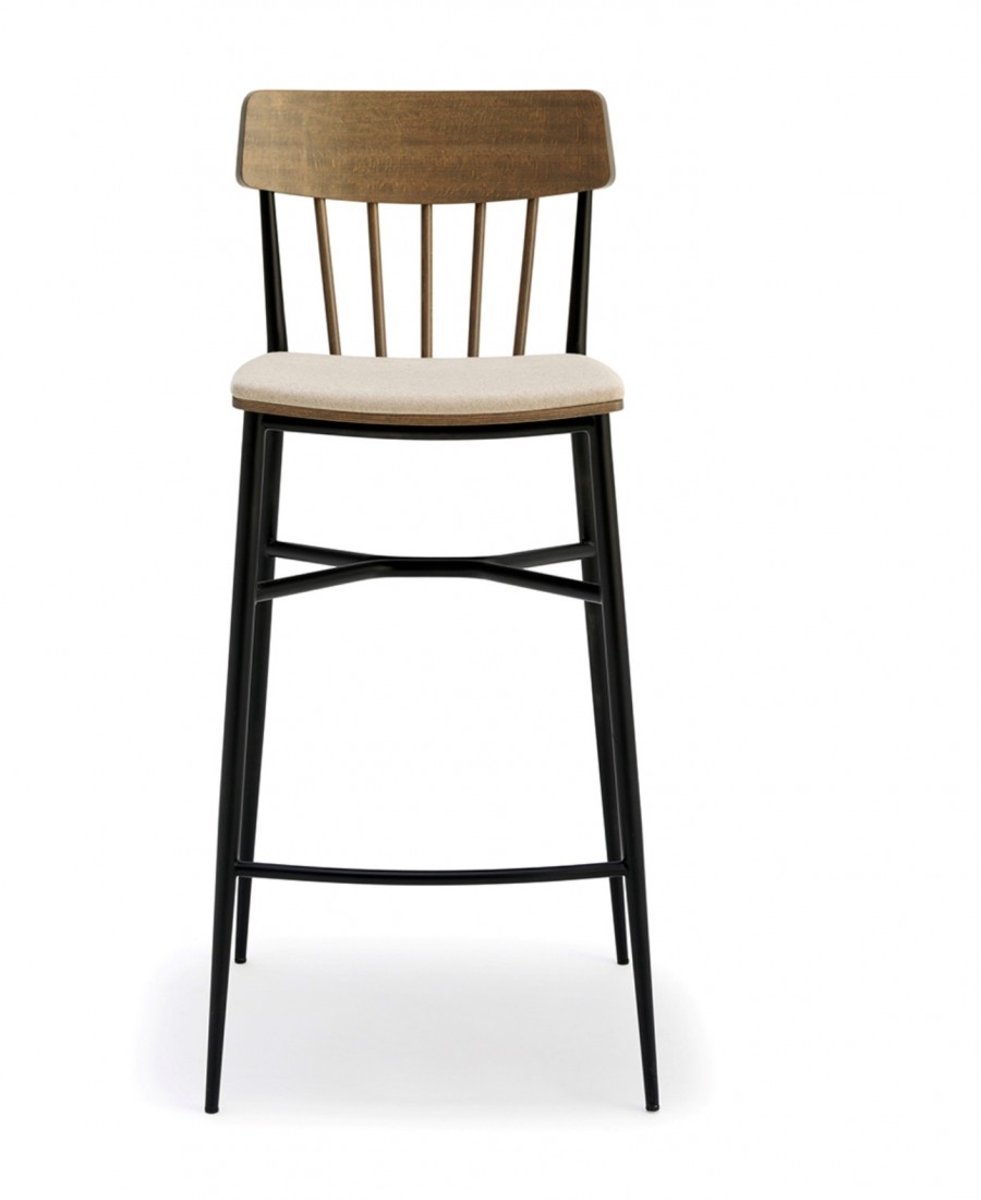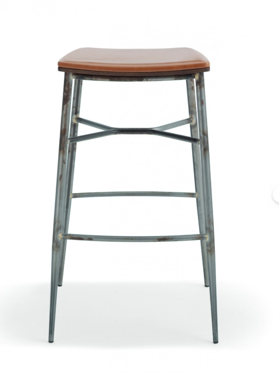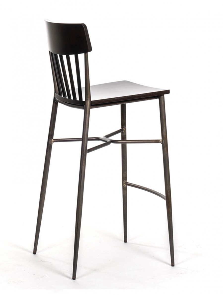 Metal Tapered 4 Legged Bar Height Stool With Integrated Foot Rest / Additional Vertical Metal Tubes Down the Back Of The Chair / Metal Tubes Can Be In The Same Finish As The Frame Or Upcharge For Contrasting Colours / Also available with no back and wooden or upholstered seat / Braced Under Seat For Added Strength For Contract Use And Added Detail / In A Range of Standard Frame Finishes / Upcharge For Additional Wood Frame And Colour Finishes / Upcharge For Additional Contrasting Paint Finishes On Vertical Struts / Additional Upcharge For Polished Finish On Vertical Struts / Also Available In A Vintage Look With Rusted Frame And Distressed Wood / Upcharge or Fixed Seat Pad, In A Wide Choice Of Fabric, Vinyl Or Leather / Generous Seating Proportions / Excellent Back Support / Counter height stools available on request with or without back / Ideal For All Restaurants, Steak Houses and Hotels.