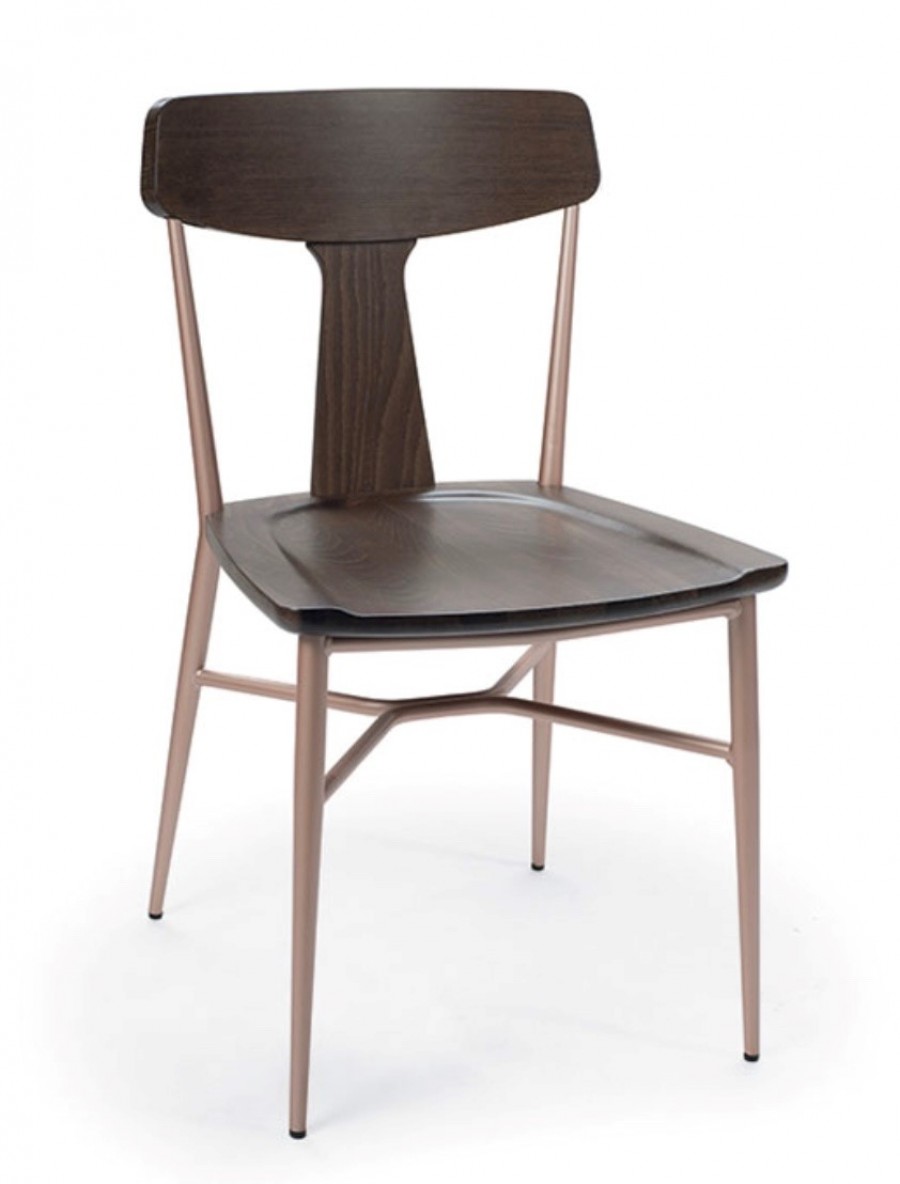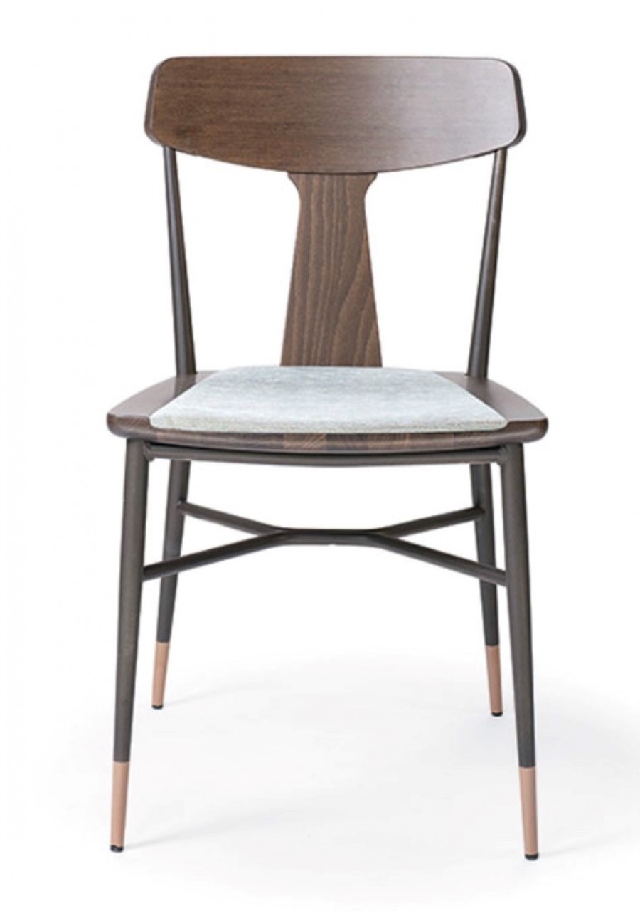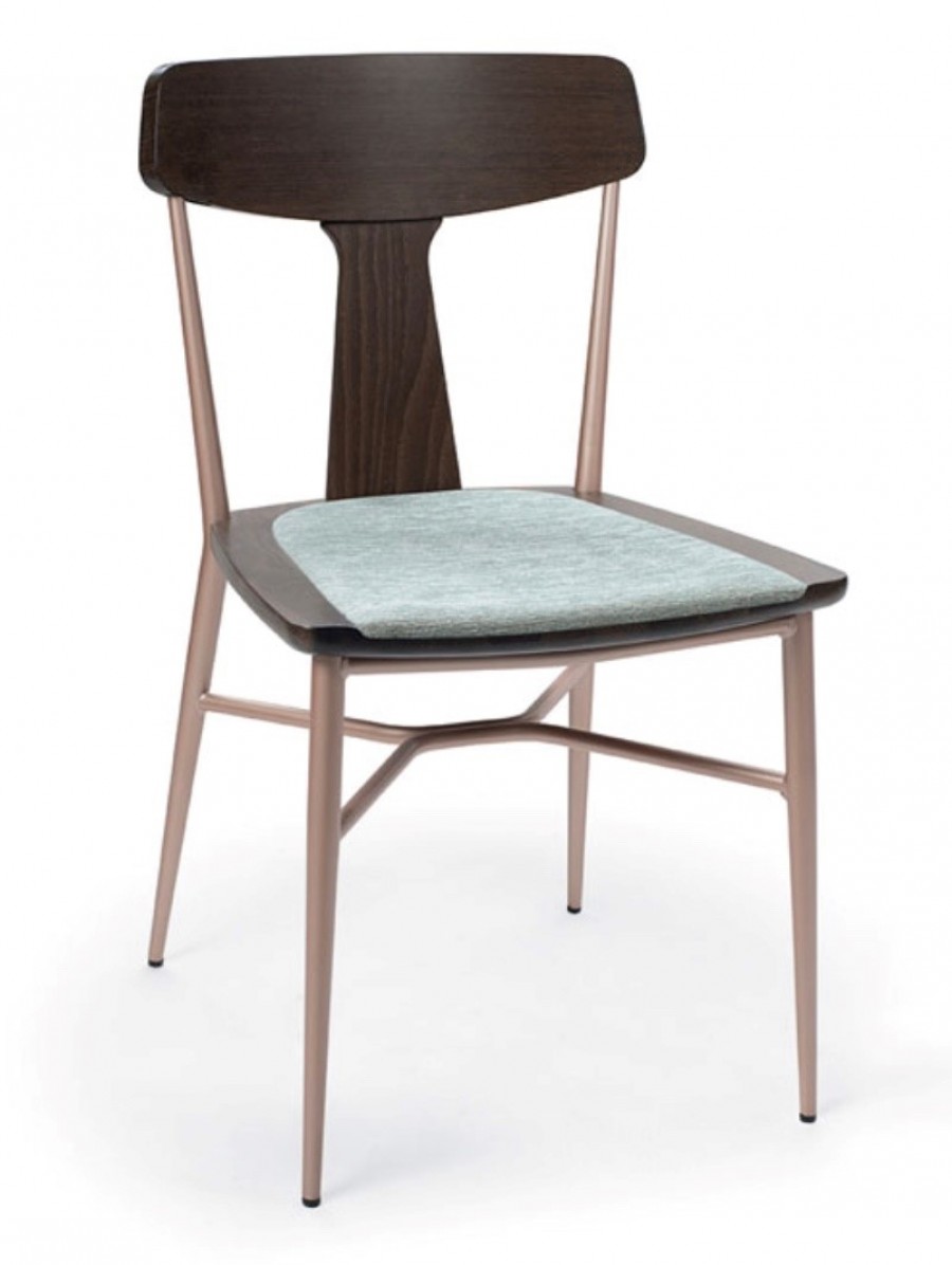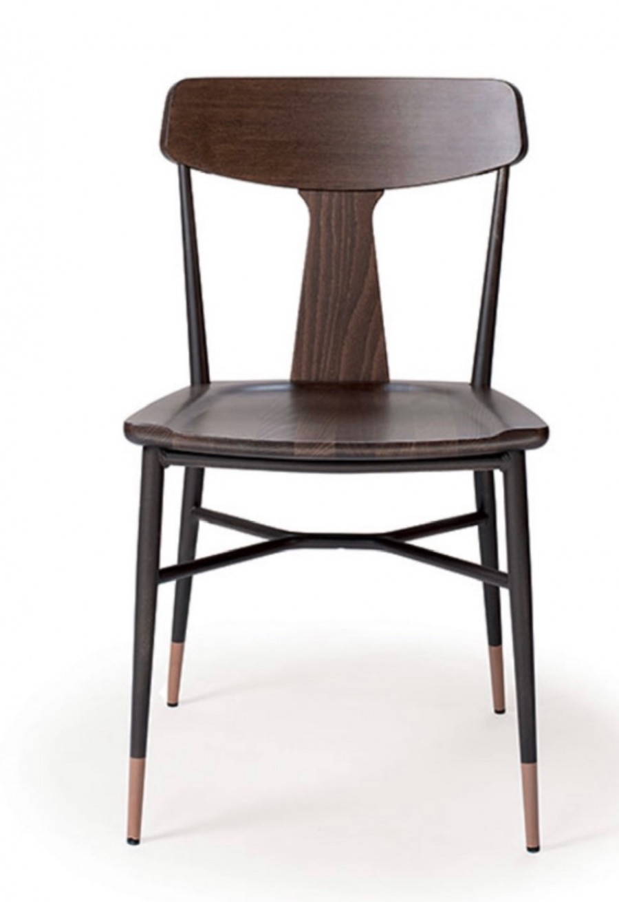 Metal Tapered 4 Legged Chair / Wooden centre infill with matching top on back of seat / Beech seat and back as standard / Braced Under Seat For Added Strength For Contract Use And Added Detail / In A Range of Standard Frame Finishes / Upcharge For Additional Frame Colour Finishes and Gold Feral frame legs / Upcharge for inserted Fixed Seat Pad with wooden boarder for added detail / In A Wide Choice Of Fabric, Vinyl Or Leather / Generous Seating Proportions / Excellent Back Support / Ideal For All Restaurants, Steak Houses and Hotels.