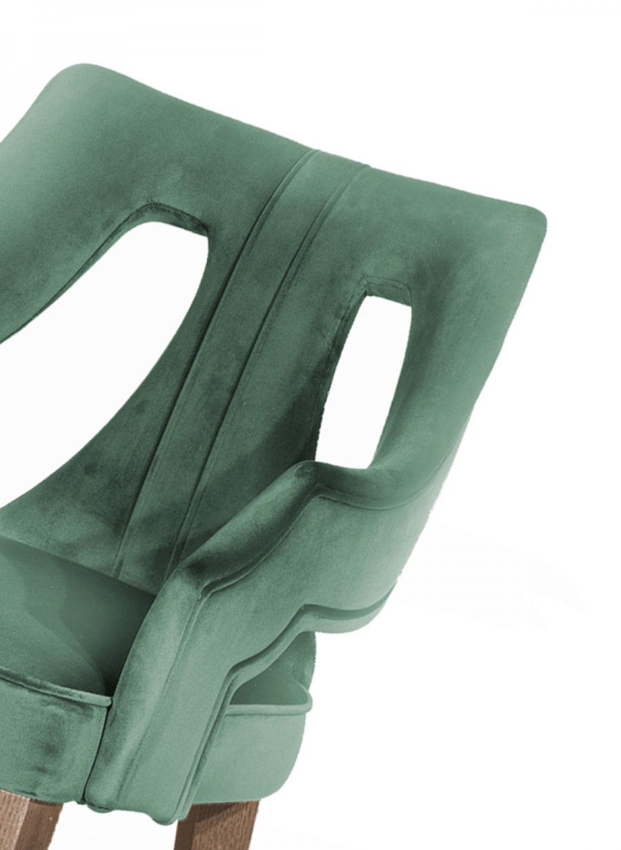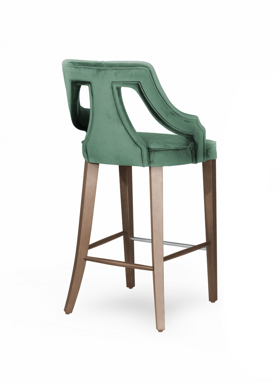 EDITION Hollywood Counter and Bar Height Stool / Regency look design with a twist of Hollywood glamour / Open back design / Beechwood standard / Upcharge for additional wood finishes / Open back design / Integrated arms / Braced all round with metal protective footrest / Shell is fully upholstered with a deep seat and excellent back support / Can be upholstered in Fabric, vinyl or leather / Wooden tapered legs / On nylon glides / Ideal for restaurants, country clubs and casinos.