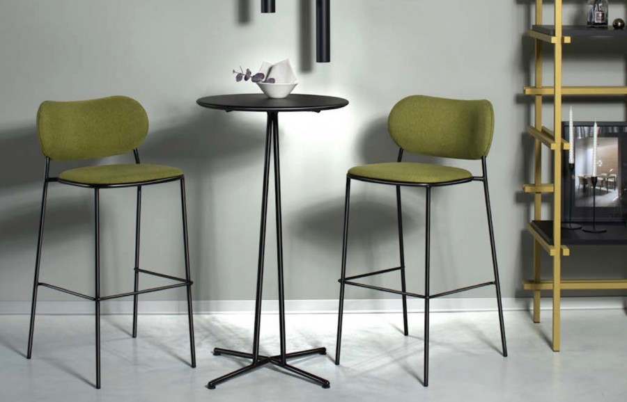 EDITION Jaya Stool / Available In Counter Height Or Bar Height / Integrated Foot Rest / Braced On Sides For Added Strength / Round Tubular Frame Fully Welded For Heavy Contract Use / Tubular Frame Runs All Round And Under Seat For Added Strength / On Nylon Glides / Fully upholstered seat and back in fabric, vinyl or leather / Available In Various Frame Colour Finishes / Very Comfortable Wrapped Back / Stackable / Ideal For All Hotels, Restaurants, Casinos, Steakhouse and Country Clubs / MINIMUM ORDER QUANTITY 10
