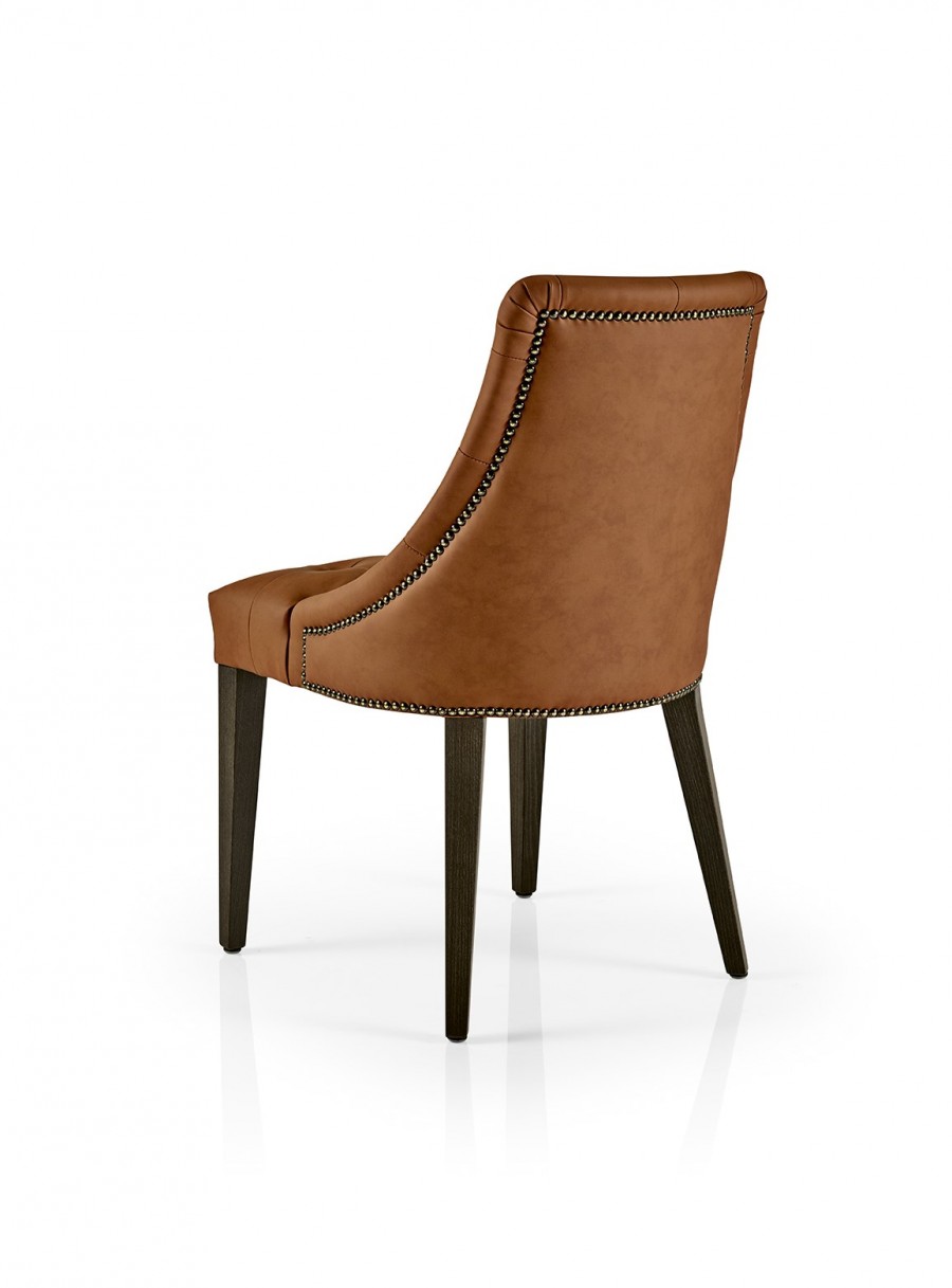 Royale Side Chair / Curved Back For Added Comfort / Button Back Seat And Internal Back For Added Upholstery Detailing / Can Be Upholstered In Fabric, Vinyl Or Leather / Nail Head Detailing On Outer Back In Various Metal Colour Finishes / Beech Tapered Legs / On Glides / Upcharge For Additional Wood Stain Finishes / Upcharge For Two Tone Upholstery / Ideal For All Restaurants, Hotels, Steakhouses, Country Clubs And Casinos