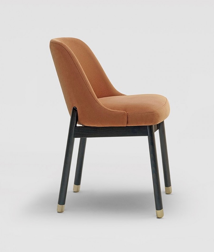 EDITION Margherita Chair has been designed for hospitality projects / Curved plywood back for added comfort / Beech Frame Standard / Well padded seat and back / Can be upholstered in fabric, vinyl or leather / Outer back legs extend up outer back for added detail / Additional wood stain finishes and colours available / Upcharge for brass ferrules / Ideal for Hotels and Restaurants.
