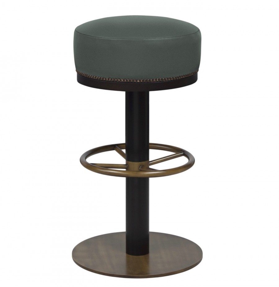 Mila Bar Stool / Well padded seat / Can be upholstered in fabric, vinyl or leather / Nail head detail / Metal steel footrest / Well weighted disc base for heavy contract use / Ideal for restaurants and bar areas.