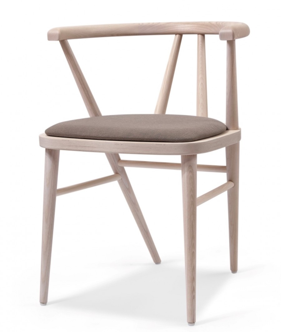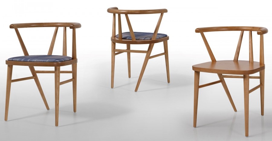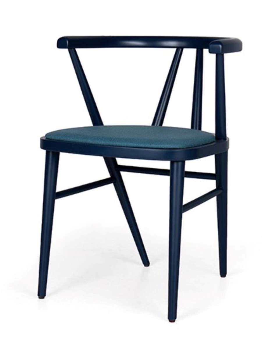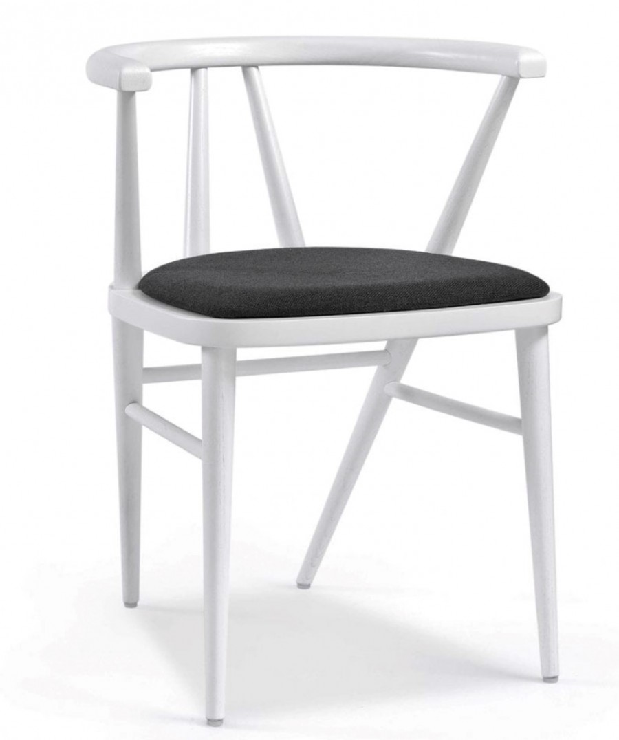 Milos Armchair / Beech wooden frame standard / Wooden tapered legs on nylon glides / Braced on sides and back for heavy contract use / Curved back for added comfort / Upcharge for wood stain or colour finishes / Also available with upholstered seat / Can be upholstered in fabric, vinyl, leather or COM fabric / Ideal for coffee shops, restaurants, hotels and country clubs.