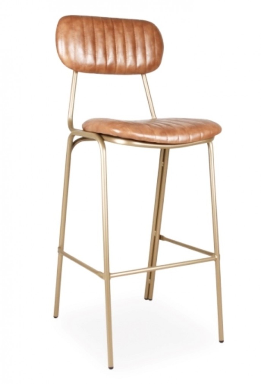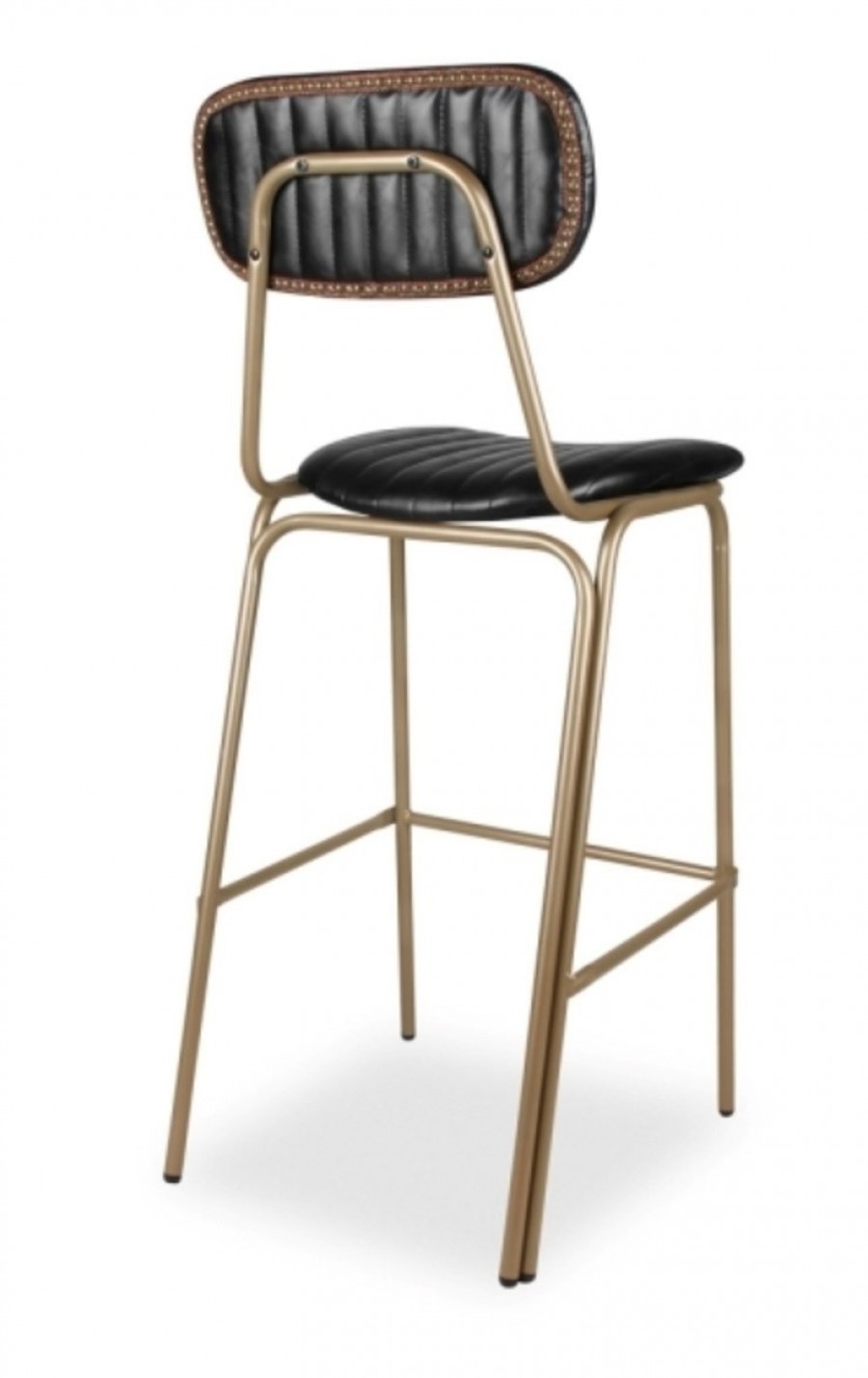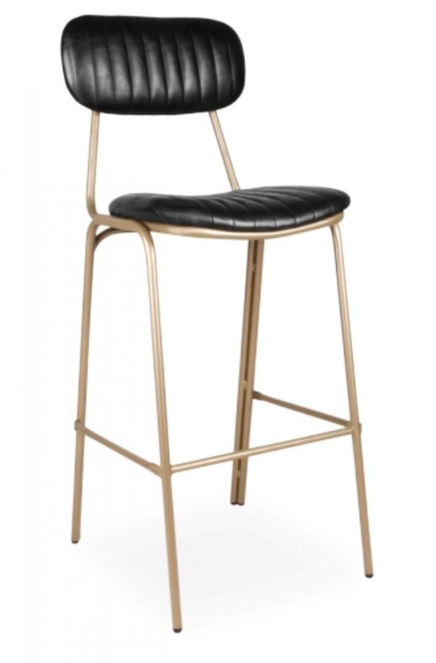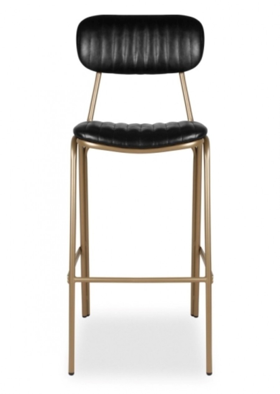 Mojito Stools available in bar and counter height / Industrial inspired design / Braced all round for heavy contract use / Integrated footrest / Round tubular frame / Brass finish standard / On nylon glides / Plywood seat and back / Fully upholstered with quilted stitch detail standard / Outer back with nail head detail / Only available in selective colour vinyl / Suitable for coffee shops, bars, restaurants or any hospitality environment.