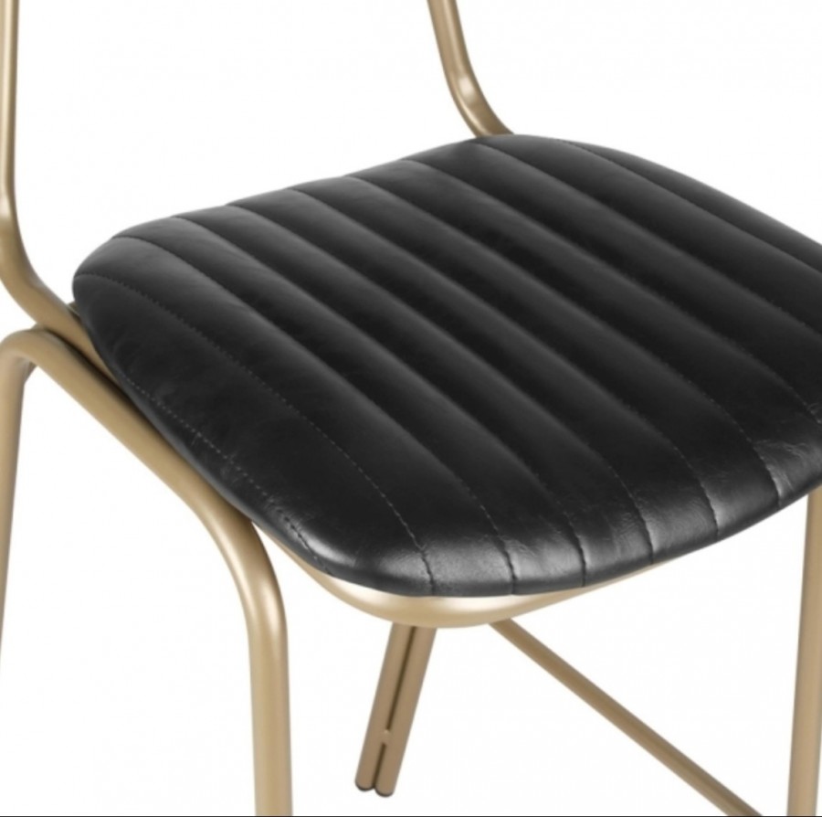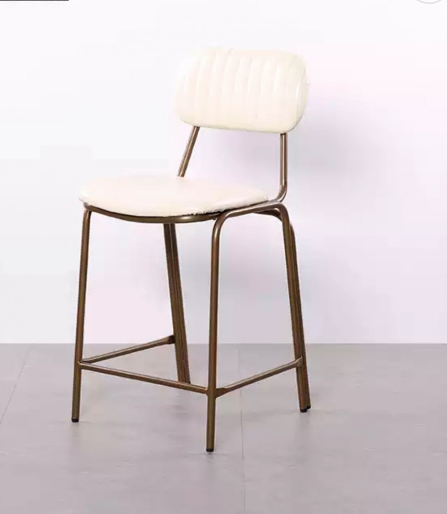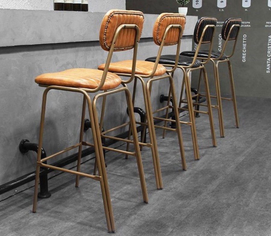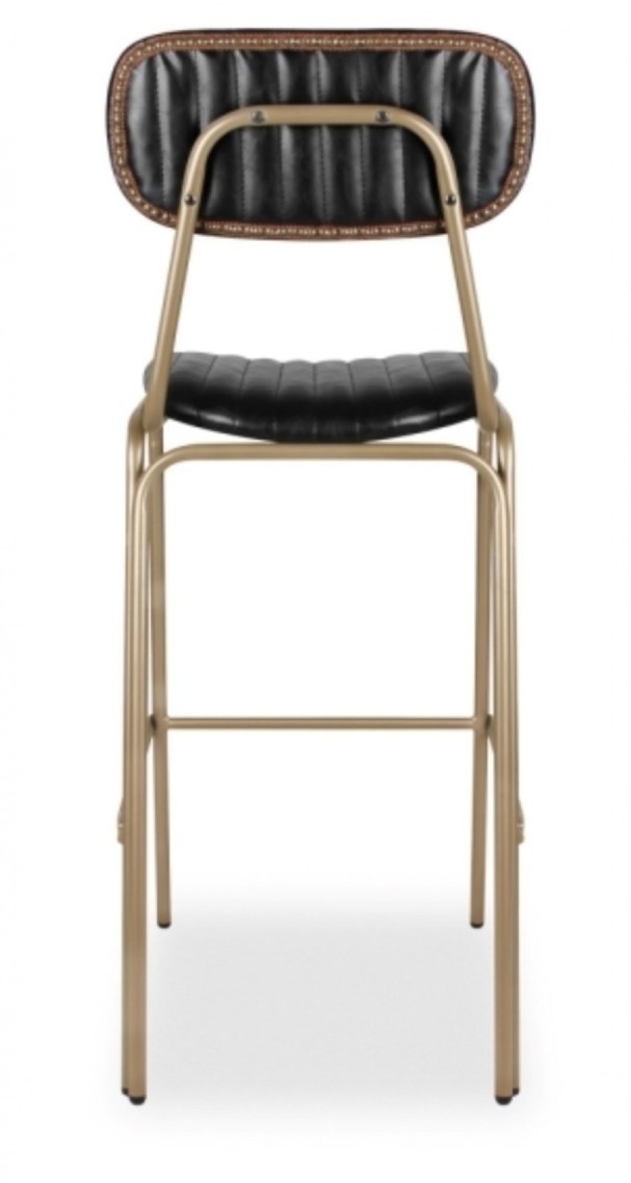 Mojito Stools available in bar and counter height / Industrial inspired design / Braced all round for heavy contract use / Integrated footrest / Round tubular frame / Brass finish standard / On nylon glides / Plywood seat and back / Fully upholstered with quilted stitch detail standard / Outer back with nail head detail / Only available in selective colour vinyl / Suitable for coffee shops, bars, restaurants or any hospitality environment.