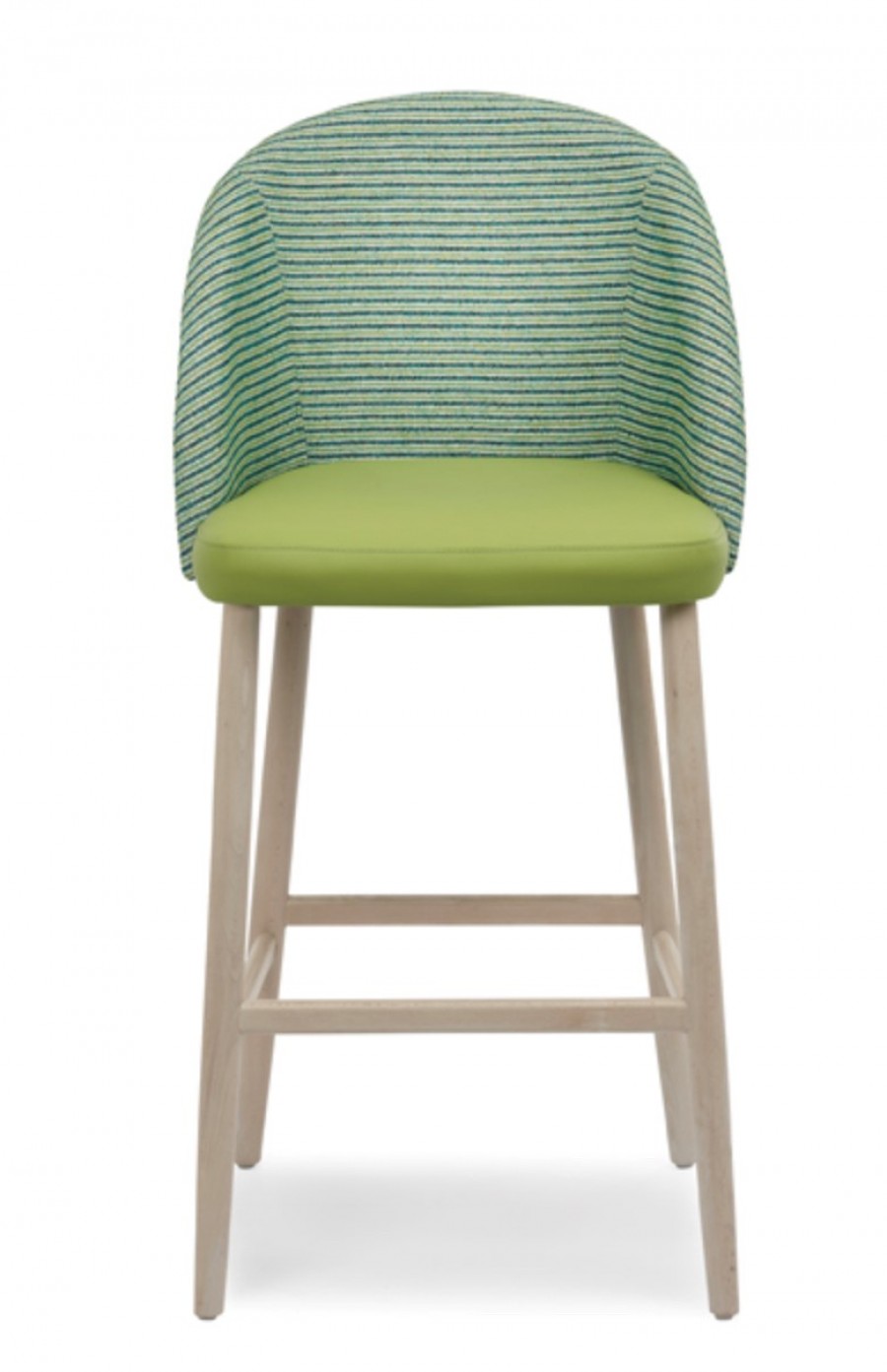 EDITION Monica Stool / Available in Counter and Bar height / Curved wrap around back with integrated arms / Generous seating proportions / Well padded seat / Upcharge for two-tone upholstery / Braced all round / Integrated footrest / Beech wooden tapered legs standard / Upcharge for additional wood stain finishes / On nylon glides / Can be upholstered in fabric, vinyl or leather / Ideal for restaurants, country clubs and casinos.