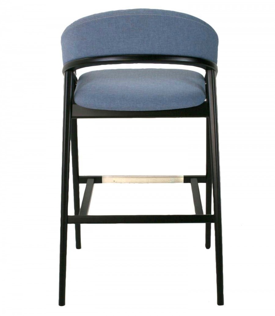 Oche high back bar stool / Four legged frame with beech wooden tapered legs standard / Braced front and back for heavy contract use / On nylon glides / Metal protective footrest / Upcharge for additional wood stain finishes / Wooden capping all round on lower part of back for added detail / Offers generous eating proportions and excellent back support / Can be upholstered in fabric, vinyl or leather / Upcharge for two tone upholstery / Ideal for restaurants, hotels, casinos and country clubs.