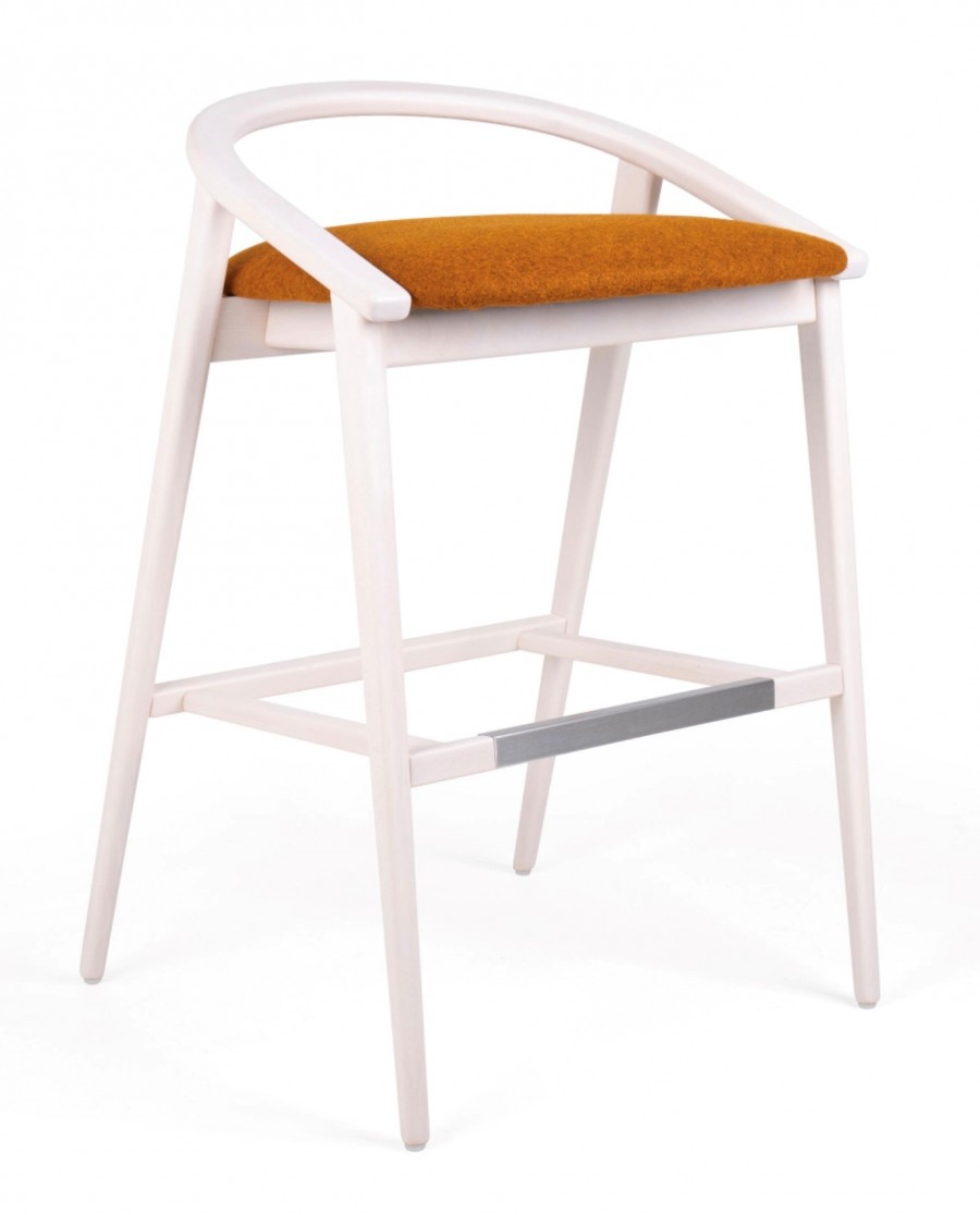 Oche low back bar stool / Four legged frame with beech wooden tapered legs standard / Braced front and back for heavy contract use / On nylon glides / Metal protective footrest / Upcharge for additional wood stain finishes / Wooden capping all round on lower part of back for added detail / Offers generous eating proportions and excellent back support / Fully upholstered seat in fabric, vinyl or leather / Upcharge for two tone upholstery / Ideal for restaurants, hotels, casinos and country clubs.