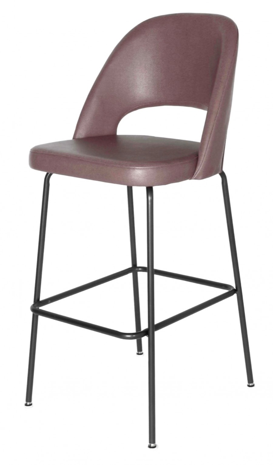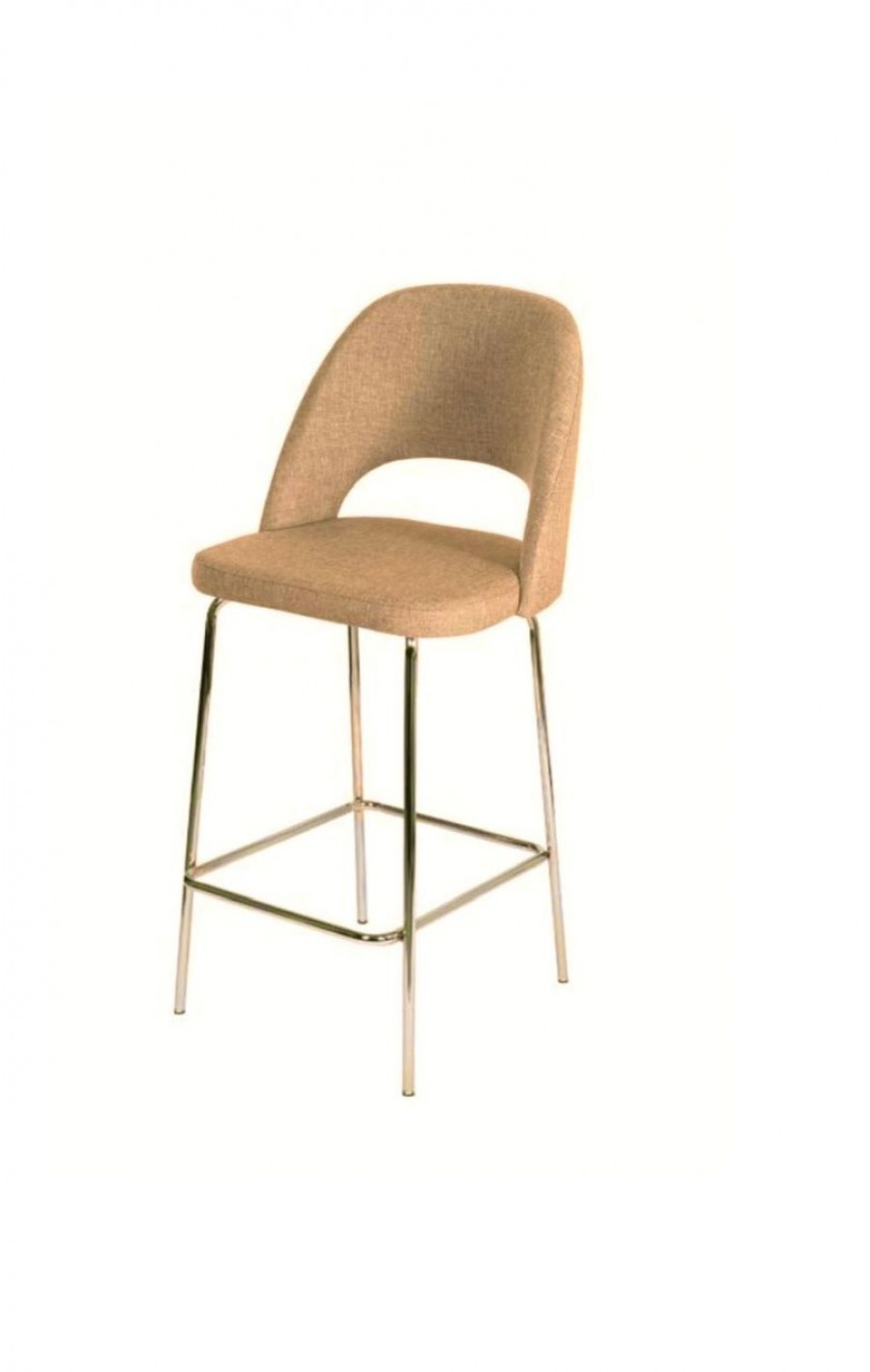Area EDITION Shell stool available in counter and bar height / Designed for all bar areas with a cost effective price point / Round tubular metal frame / Round tubular metal footrest / Polished chrome or black painted standard / Upcharge for brass finish / Curved back for added comfort / Slot in back for added detail / Well padded seat for comfort / Fully upholstered / Upcharge for two tone upholstery / Available in graded in fabrics or COM (Customer's Own Material)