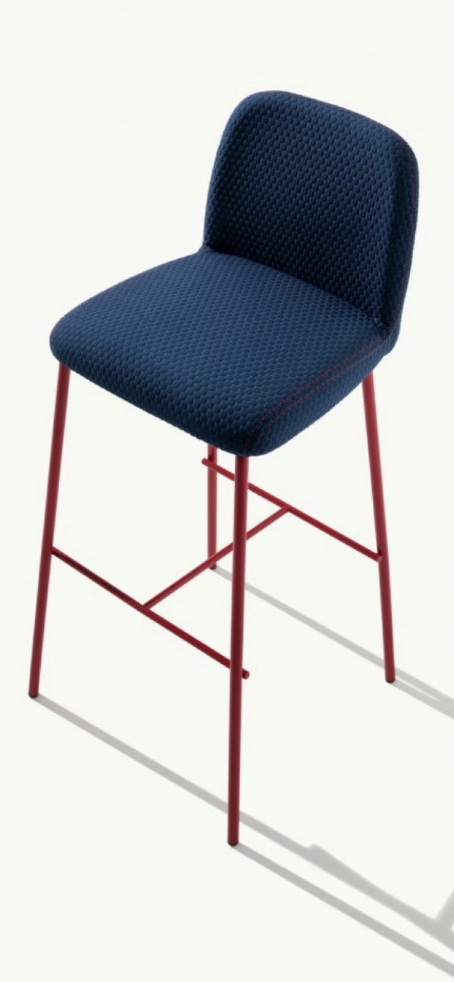 EDITION Stiltsville Stool / Counter and Bar Height available / Plywood shell / Well padded seat and back / Fully upholstered / Can be upholstered in fabric, vinyl or leather / Generous seating proportions / Metal round tubular frame / On nylon glides / Integrated footrest / Various painted colour finishes available / Upcharge for polished chrome / Braced on sides and centre for heavy contract use / Ideal for all hospitality environments.