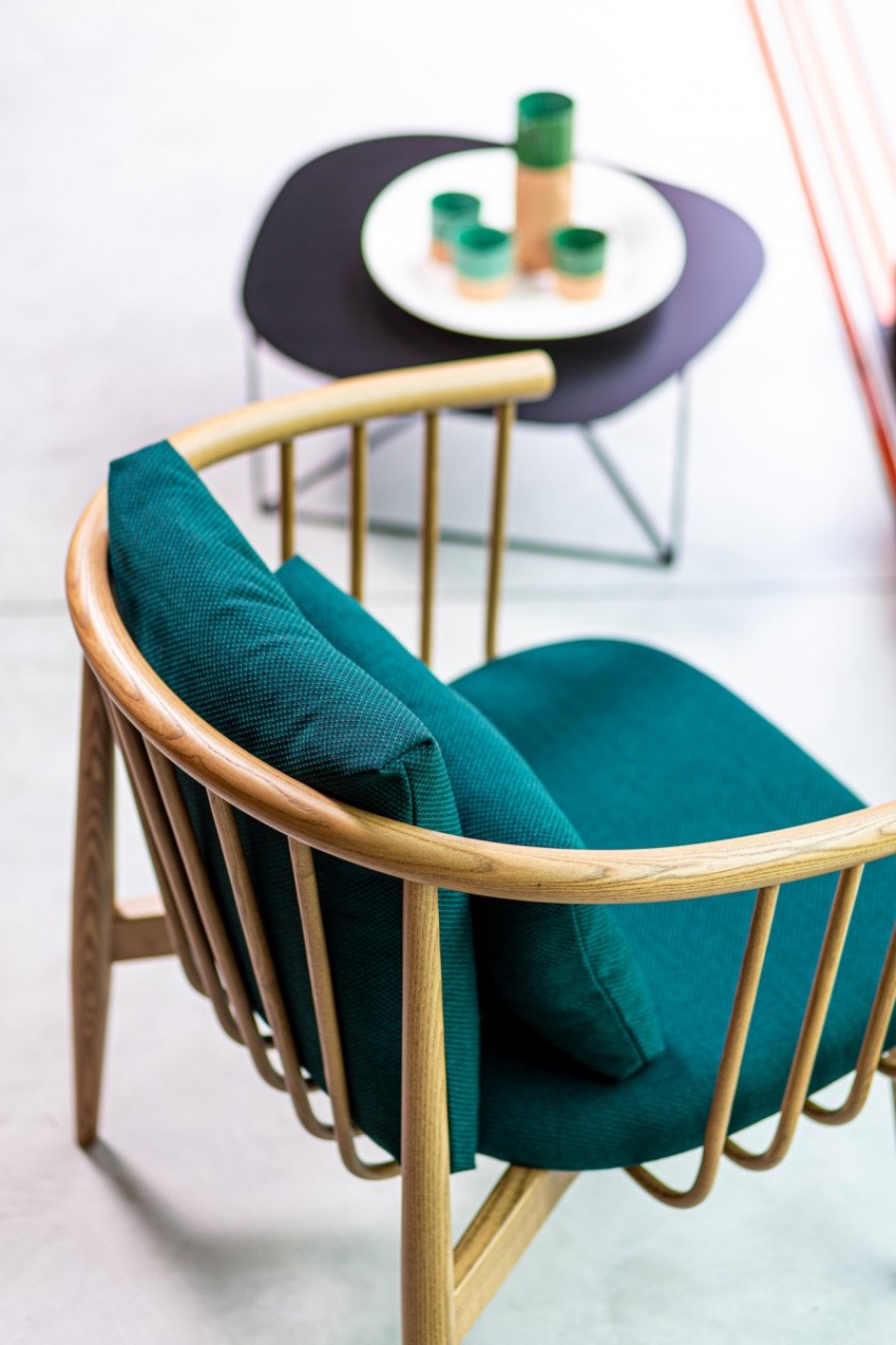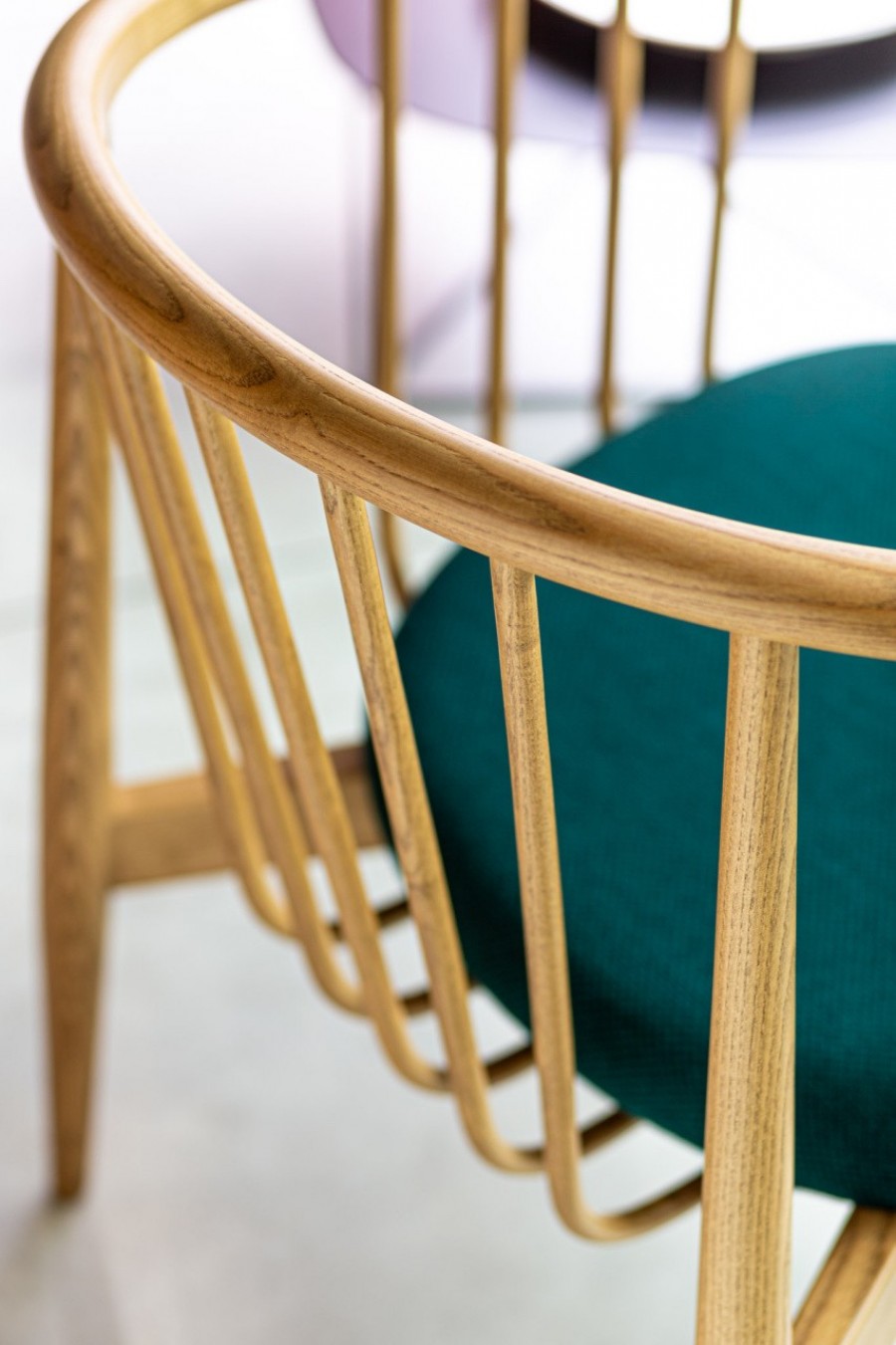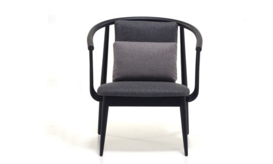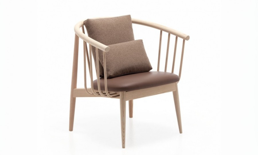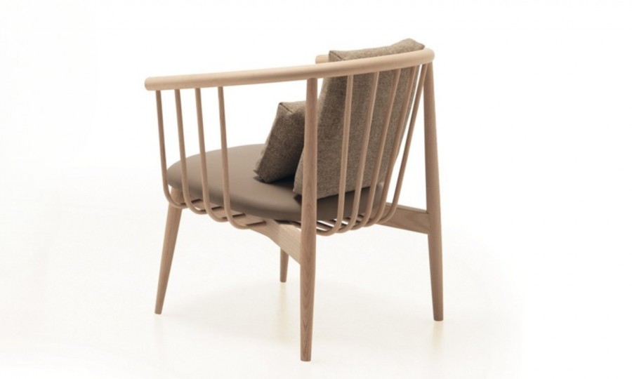 Area EDITION Tivoli Lounge Chair / Ash wood tapered legs standard / Upcharge for additional wood stain and colour finishes / Integrated Arms / Curved Wooden Rods on Side and Back For Added Detail / Seat cushion and 2 back scatter cushions standard / Loose Seat and Back Cushions / Ideal for all Hotel Lounge and Lobby Areas
