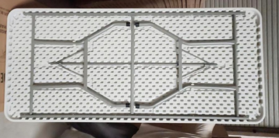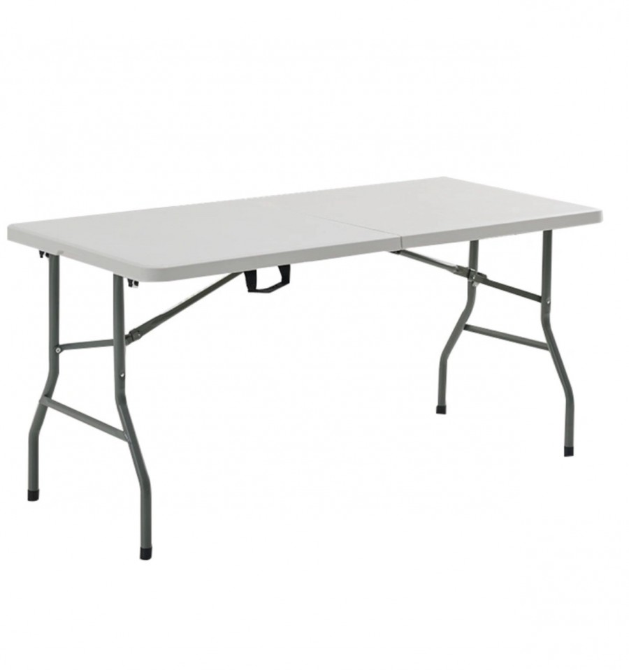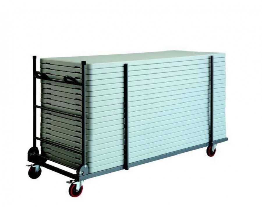 Event table collection / Rectangular format / Folding table top and legs / Lightweight construction / Available in 3 sizes / Top is 0.7 inches thick / High impact polypropylene white finish only / Round tubular steel legs with non-marking nylon glides / Legs fold within the frame to store flat / Fully welded / Braced on sides for heavy contract use / Smooth rounded corners and edges to table top / Seamless edges for hygiene and ease of wipe down / Carrying handle for use when table is fully folded / Upcharge for dolly for easy manoeuvrability and storage / Ideal for large hotel functions, exhibitions centres, educational use and hospitals.