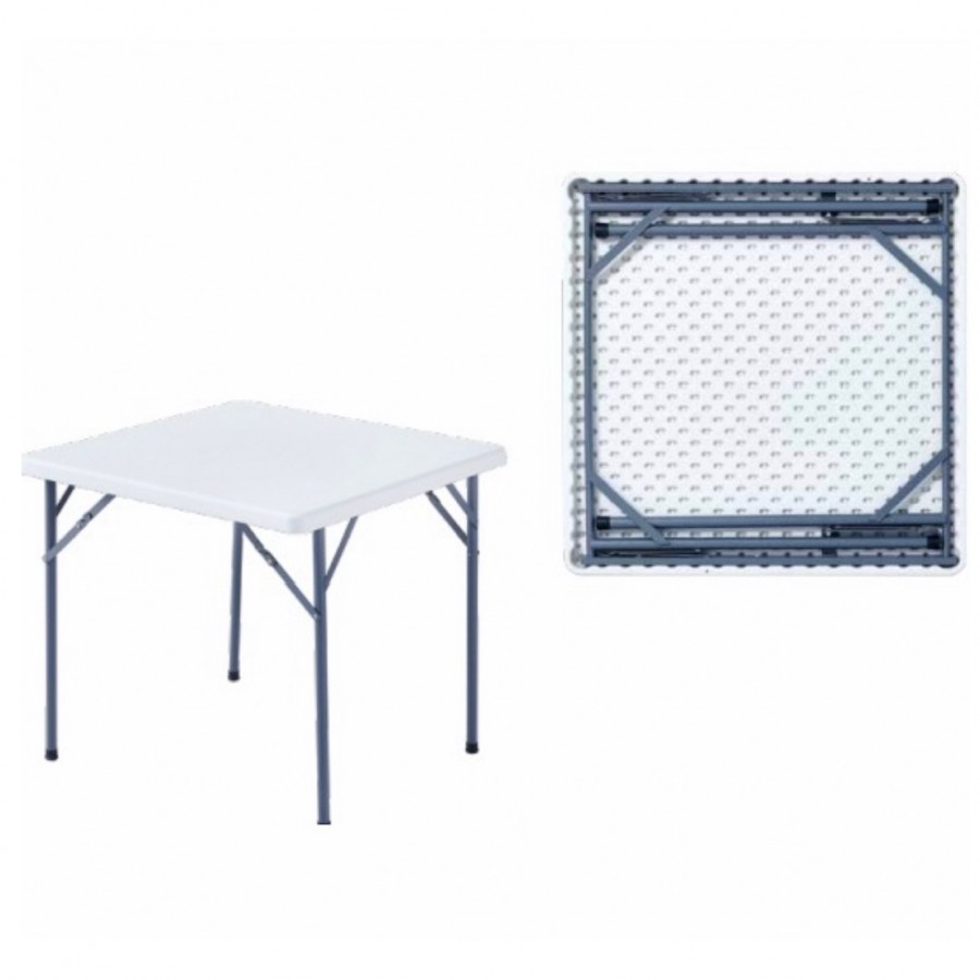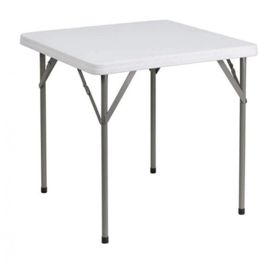 Event table collection / Square format / Folding table top and legs / Lightweight construction / Top is 0.7 inches thick / High impact polypropylene white finish only / Round tubular steel legs with non-marking nylon glides / Legs fold within the frame to store flat / Fully welded / Braced on sides for heavy contract use / Smooth rounded corners and edges to table top / Seamless edges for hygiene and ease of wipe down / Carrying handle for use when table is fully folded / Upcharge for dolly for easy manoeuvrability and storage / Ideal for large hotel functions, exhibitions centres, educational use and hospitals.