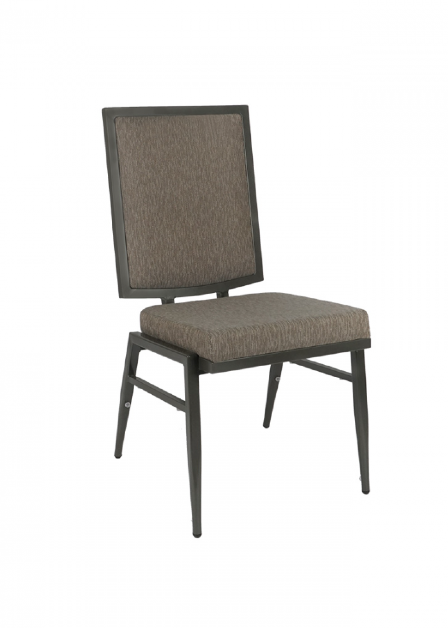 Norma Aluminum Banquet chair / Square Tube Heavy Duty Frame / Tapered legs / Powder coated finish / Fully welded frame for heavy contract use / Choice of frame color finishes available / Stretchers on sides for added strength / Plastic Stack Bumpers to prevent scratching / Stackable to the height of doorways or beyond / On nylon glides / Fully upholstered seat, inner and outer back in a wide choice of COM or graded in fabrics / Offers excellent comfort for prolonged periods of time / Upcharge for dolly / Ideal for all large scale hospitality venues, hotels, restaurants and conference venues.