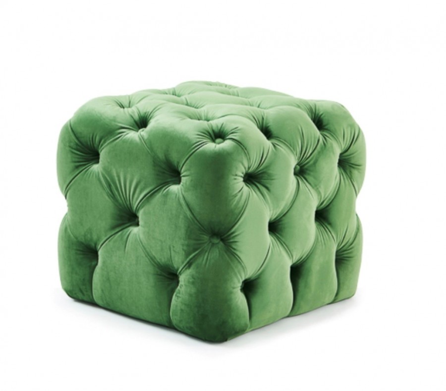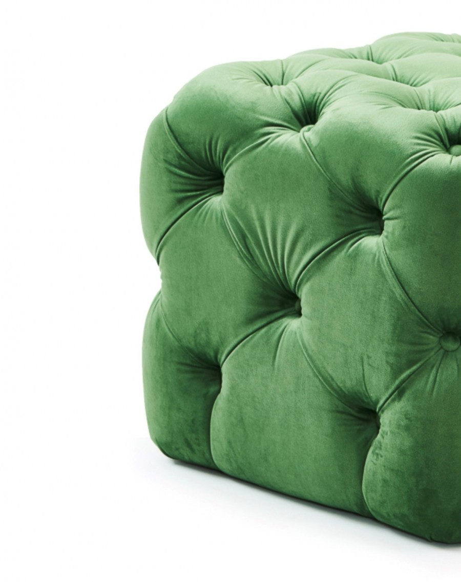 Rubik / Square stool/pouffe / Deep button design / On nylon glides / Fully upholstered / Can be upholstered in fabric, vinyl or leather / Upcharge for two-tone upholstery and contrasting buttons / Can be used in all hospitality environments including restaurants, hotels, hotel bedrooms.