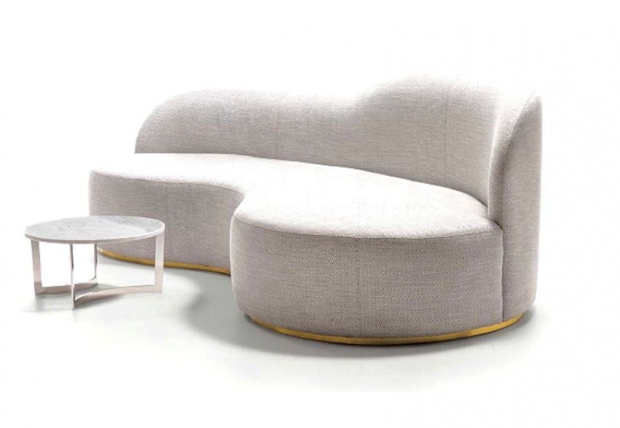 EDITION Majestic Curved Love Seat / Brass Plinth Standard / Generous Seating Proportions / Well Padded Seat Cushion / Sprung Seat / Fully Upholstered Seat And Curved Back / Fully Upholstered Curved Integrated Arms / Deep Seat For Added Comfort / Available With Two Tone Upholstery / Ideal For Lounge Areas, Lobby Areas And Hotel Bedrooms