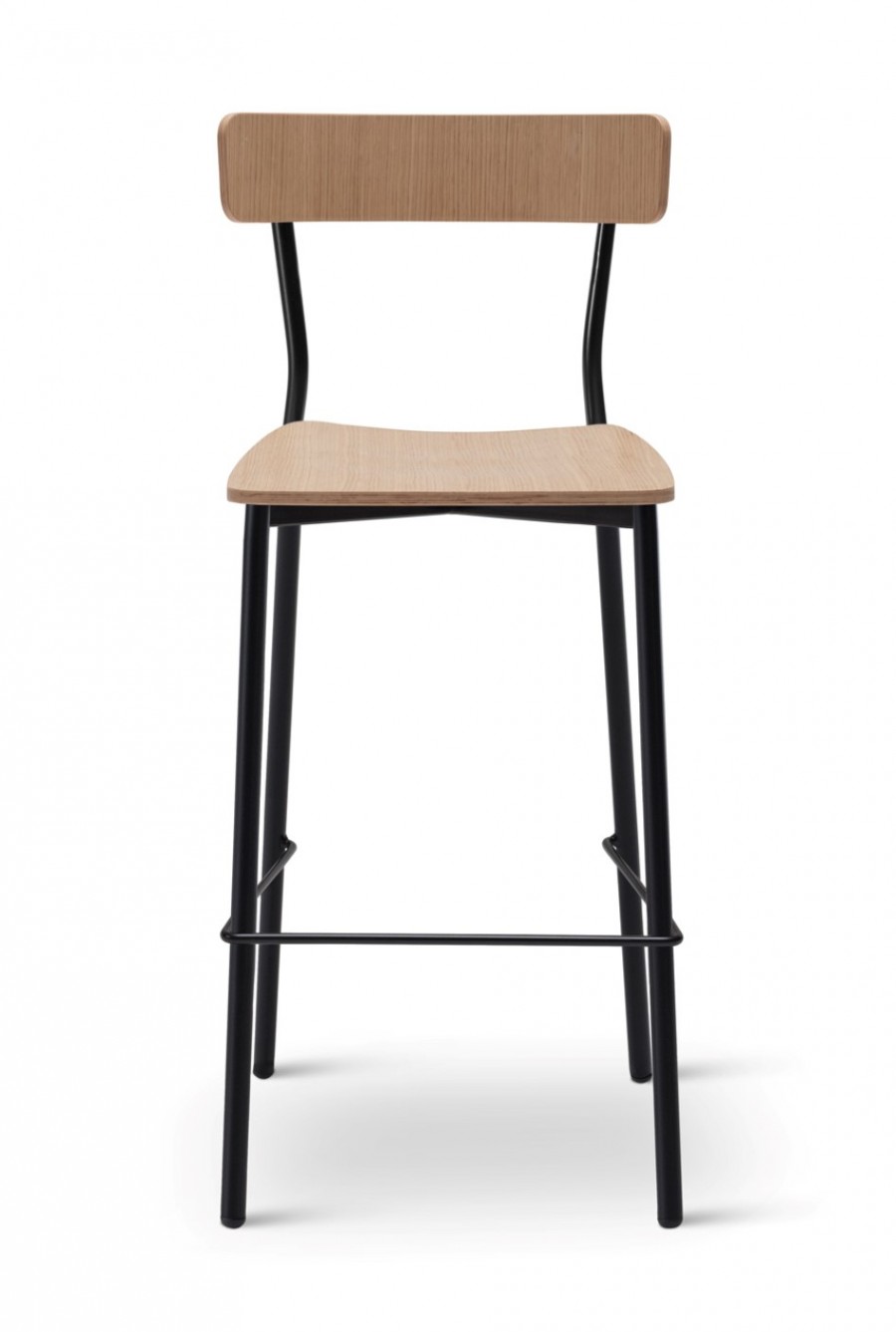 Brandon Stool / Available in counter or bar height / Available in black painted frame standard / beech plywood seat and back / Curved back for added comfort / Integrated footrest / No visible fixings on internal seat and back / Round tubular frame / Braced under seat for added strength / On nylon glides / Beech finish standard / Upcharge for upholstered seat / Can be upholstered in fabric, vinyl or leather / Ideal for restaurants, cafes and the workplace.