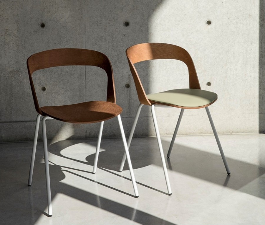 Cooper Side Chair / Natural ash multi-layered plywood shell standard with curved back / Cut out back for minimalistic design / Upcharge for additional wood stain finishes / Seat pad available, can be upholstered in fabric, vinyl or leather / Round metal tubular frame in a choice of color finishes / Fully welded frame / On nylon glides / Stackable 6-8 on the floor / Upcharge for dolly / Stackable 8-10 on dolly / Ideal for coffee shops, restaurants, retail environments.