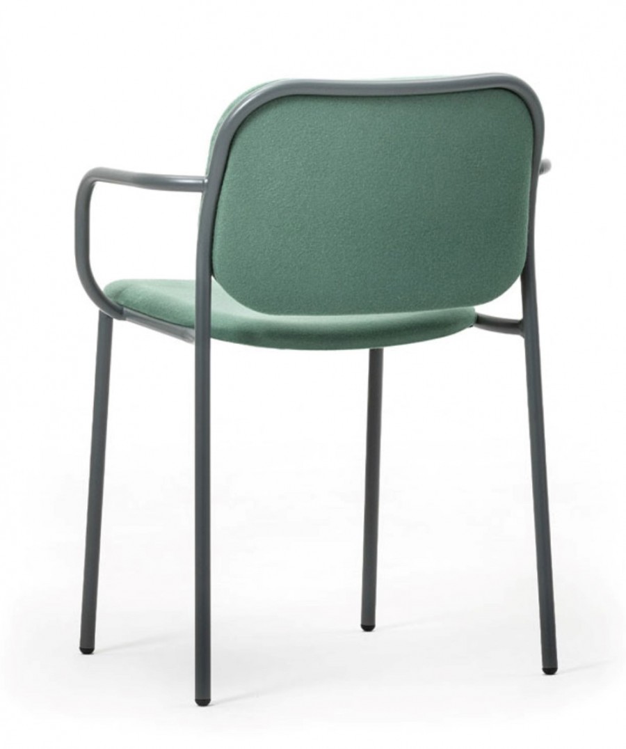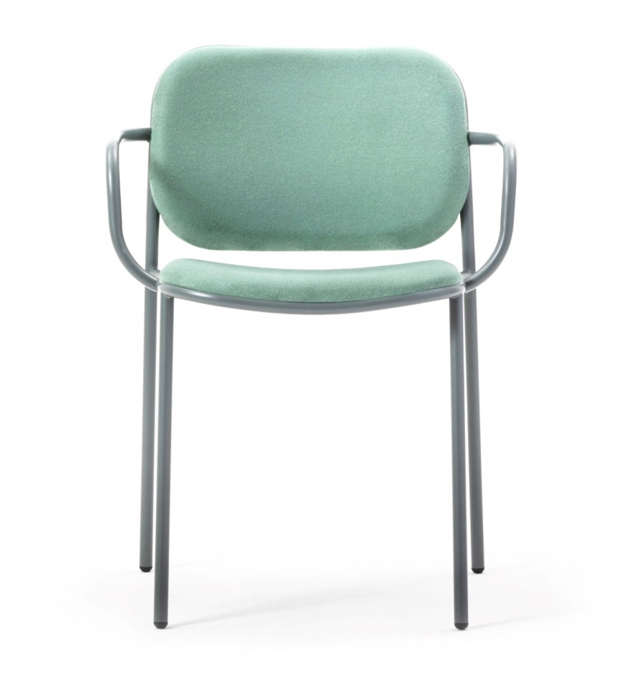 Jaeger Armchair / Round metal tubular frame with integrated arms / Stackable 4-5 high / On nylon glides / Available in standard painted finishes or upcharge for additional frame colour finishes including brass, chrome and black chrome / Fully welded frame for heavy duty contract use / Well padded seat and back / Can be upholstered in fabric, vinyl or leather / Generous seating proportions / Deep seat for added comfort / Ideal for hotel lobbies and meeting areas.