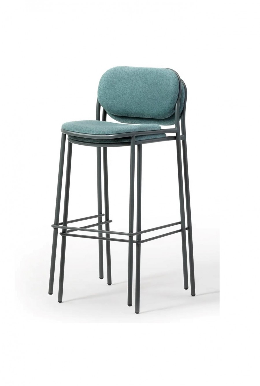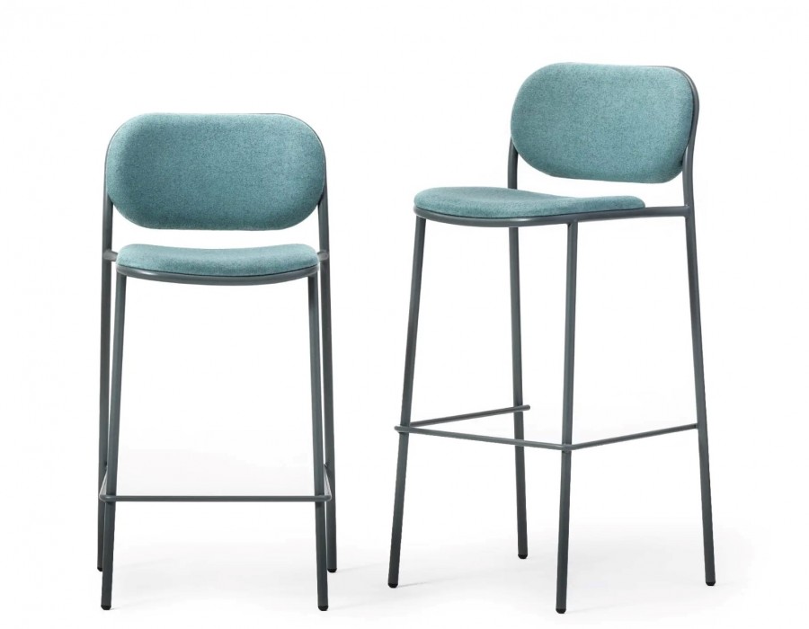 Jaeger Stool / Available in stackable counter and bar height / Round metal tubular frame / Stackable 4-5 high / Integrated footrest / On nylon glides / Available in standard painted finishes or upcharge for additional frame colour finishes including brass, chrome and black chrome / Fully welded frame for heavy duty contract use / Well padded seat and back / Can be upholstered in fabric, vinyl or leather / Generous seating proportions / Deep seat for added comfort / Ideal for hotel lobbies and meeting areas.