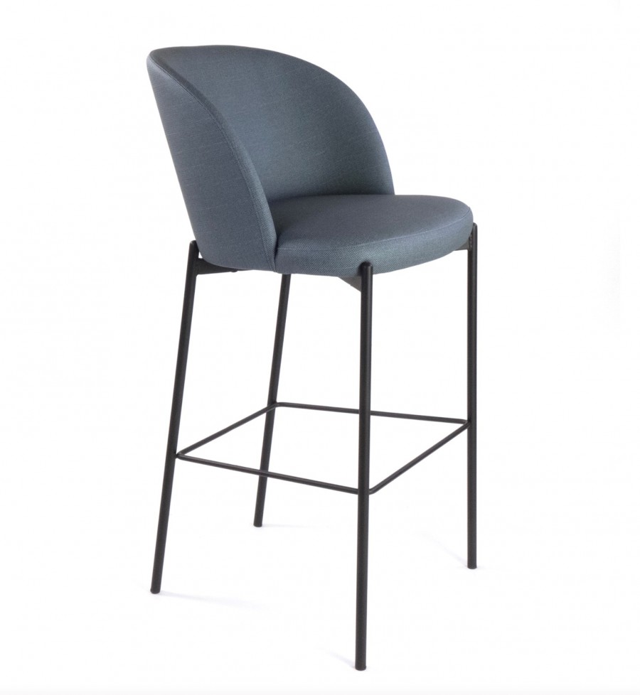 Maison Stool / Available in counter or bar height / Plywood seat and back with wrap back for added comfort / Round tubular metal frame / Black painted standard / Upcharge for brass finish / Integrated footrest / Braced under seat for heavy contract use / On nylon glides / Can be upholstered in fabric, vinyl or leather / Ideal for restaurants, casinos and country clubs.
