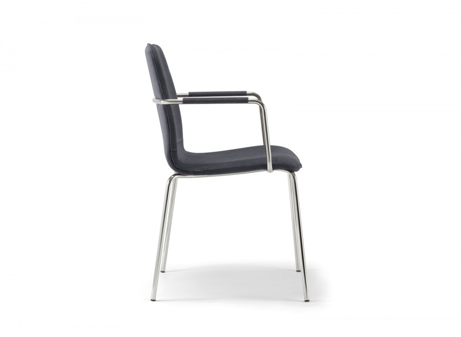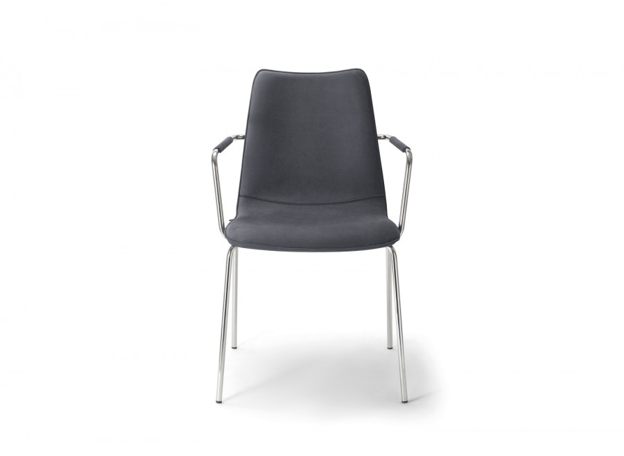 Moxy Collection : Arm Chair / Protective Arm Caps / Round Tubular Frame on Nylon Glides / Polished Chrome Standard / Upcharge for Black or White Frame / Plywood Shell / Fully Upholstered / Can Be Upholstered in a Wide Choice of Fabric Options, Including Vinyl, Fabric or Leather/ Stackable on Floor -10 High / Stackable on Dolly- Maximum 35 / Ideal for Meeting Rooms, Breakout Spaces, Educational Spaces