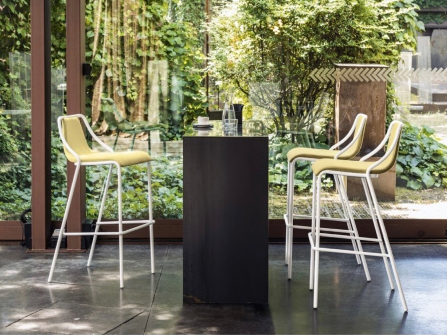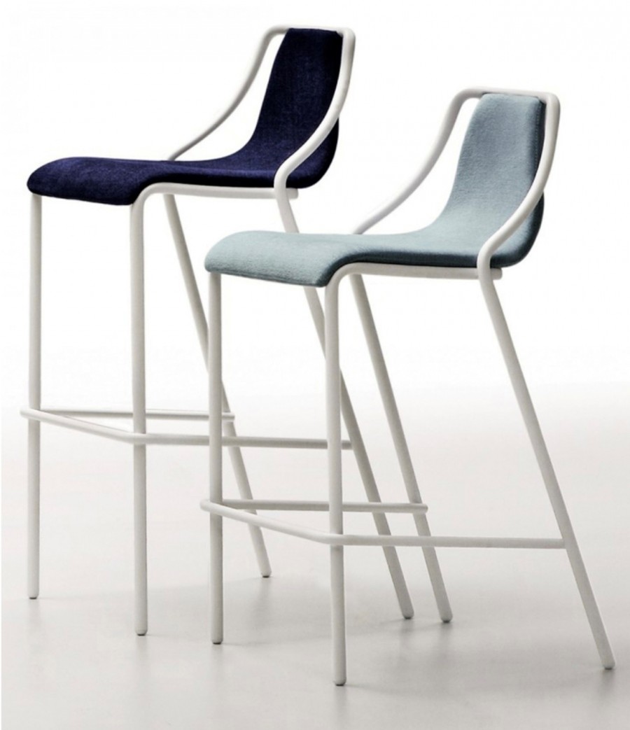 Nexo Stool / Available in counter and bar height / Round tubular frame / Fully welded / Black or white frame standard / Upcharge for additional color finishes / Not Stackable / Centre plywood shell, fully upholstered with curved waterfall edge on front of seat / Available in fabric, vinyl or leather / Braced on sides and front with integrated footrest / Ideal for all bar areas, hotels, retail use and coffee shops.