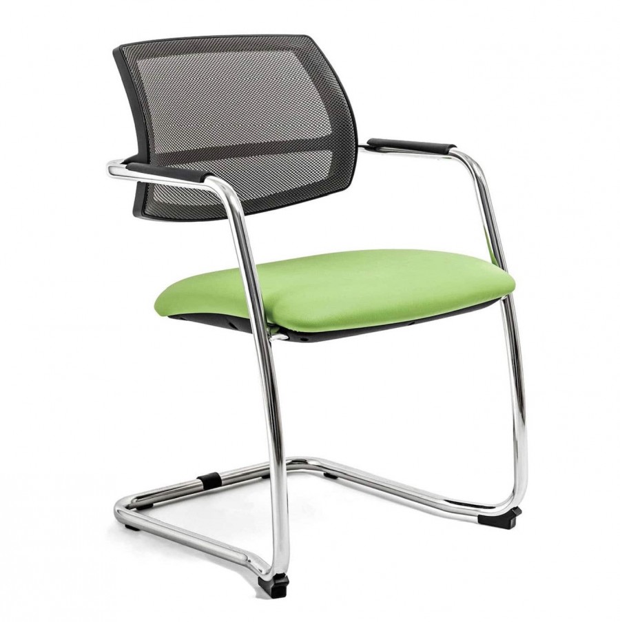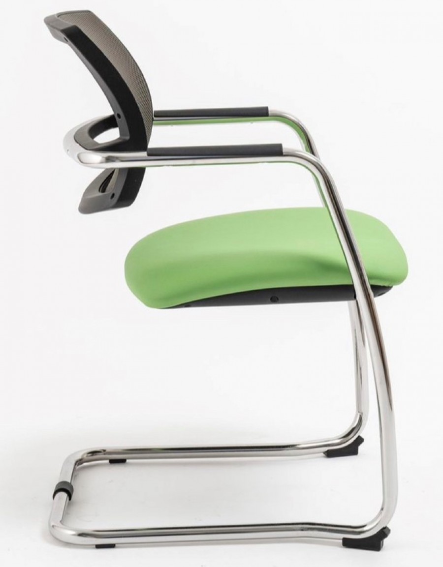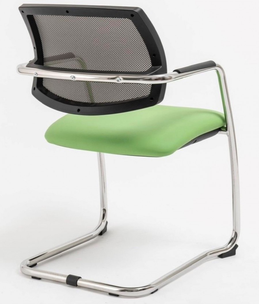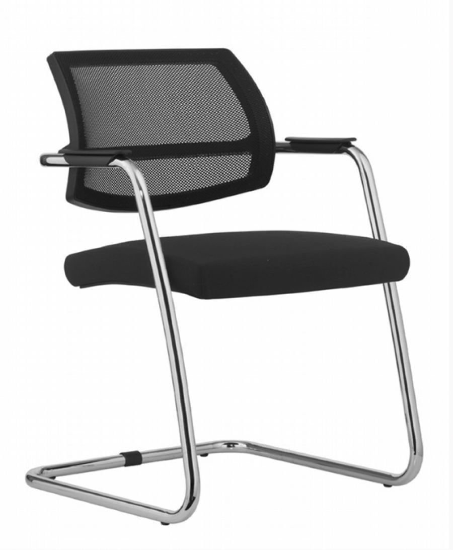 Boston Chair / Cantilever Frame / Integrated Arms / Polished Chrome frame standard / Fully upholstered seat, can be upholstered in a wide choice of fabric, vinyl or leather / Mesh Back in Black Standard / Stackable x 5 / On Nylon Glides / Ideal For Workplace Environments, Conference and Meeting Rooms.