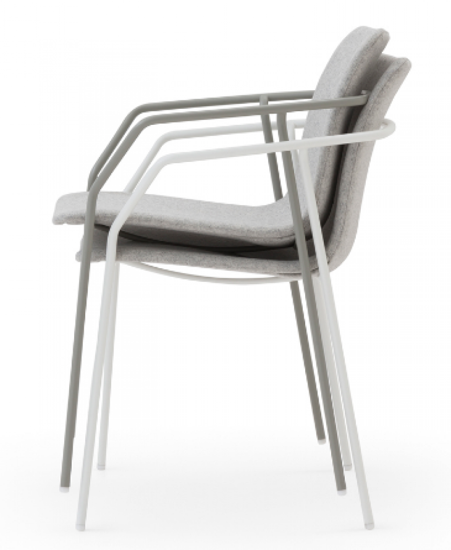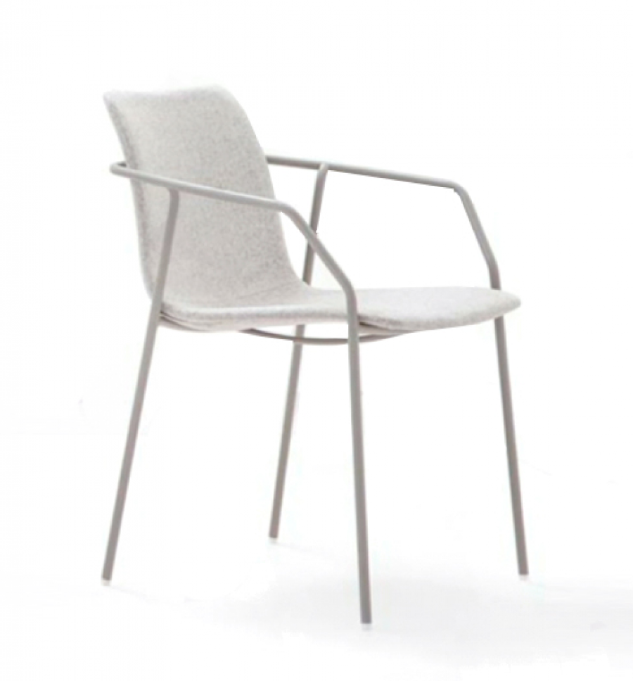 Diego Upholstered Arm Chair / Round Tube Metal Frame with Integrated Arms / White and Black Painted Finish Standard / Upcharge for Additional Colour Finishes / Beech Plywood Shell Fully Upholstered / Available in a Variety of Fabric Options / Stackable / Ideal for all Hotels, Restaurants and Hospitality Environments.