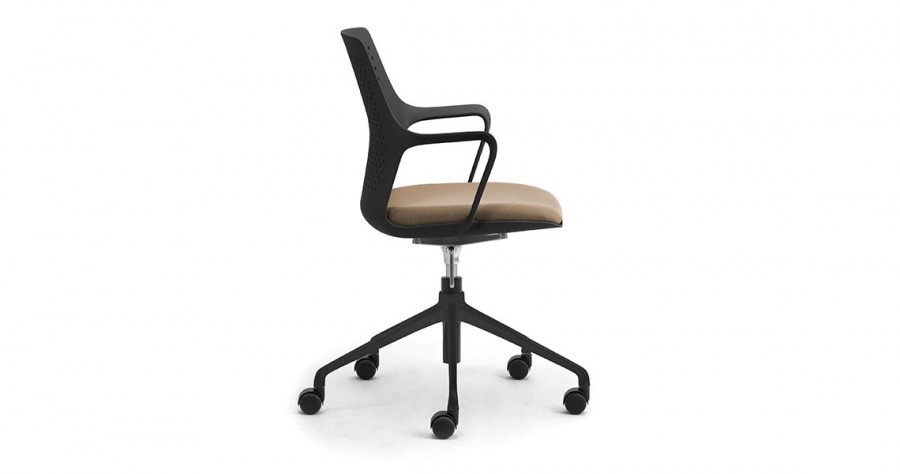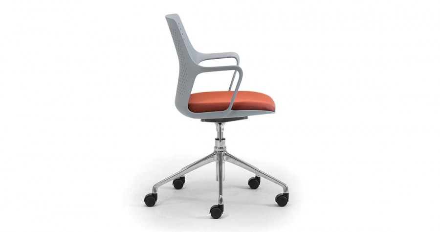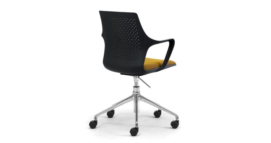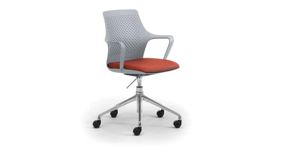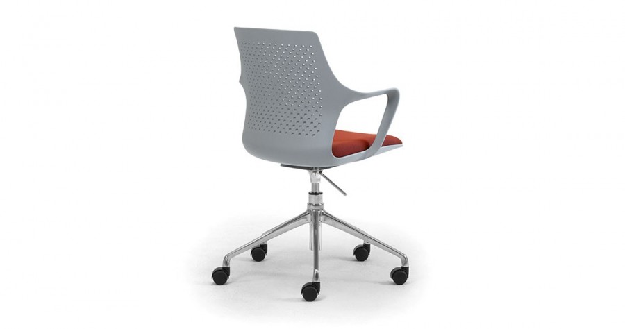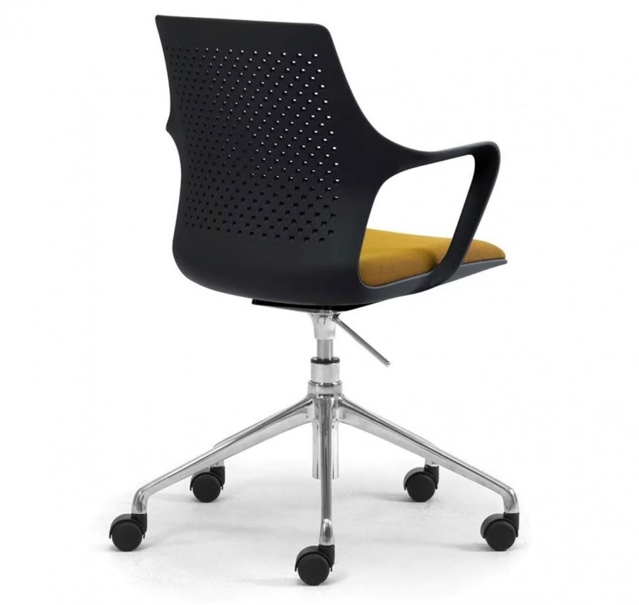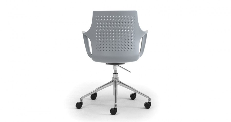 East 5 Star Swivel Base on Castors / One Piece Moulded Polypropylene Shell / Gas height adjustable with synchro-mechanism / With Perforated Back / Available in Black, White or Grey Only / Integrated Arms / Generous Proportioned Seat for added Back Support / Fixed Seat Cushion with Various Choice of Fabrics / Fixed Height / Black 5 Star Swivel Base Standard / Upcharge for Polished Aluminum 5 Star Base / Ideal for any office environment.