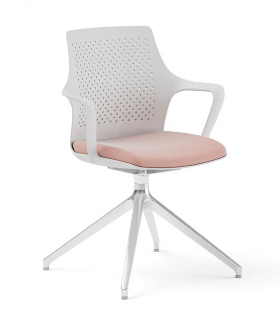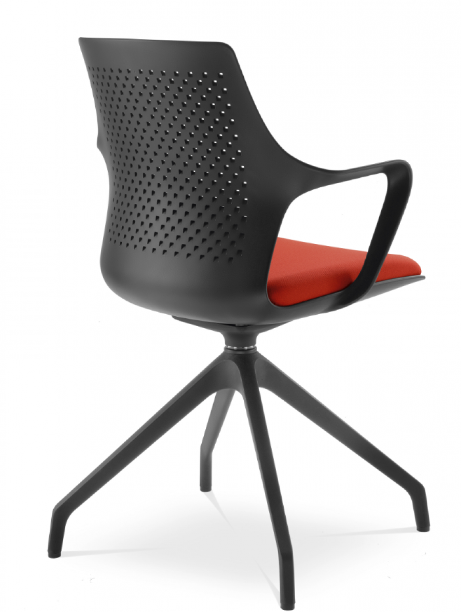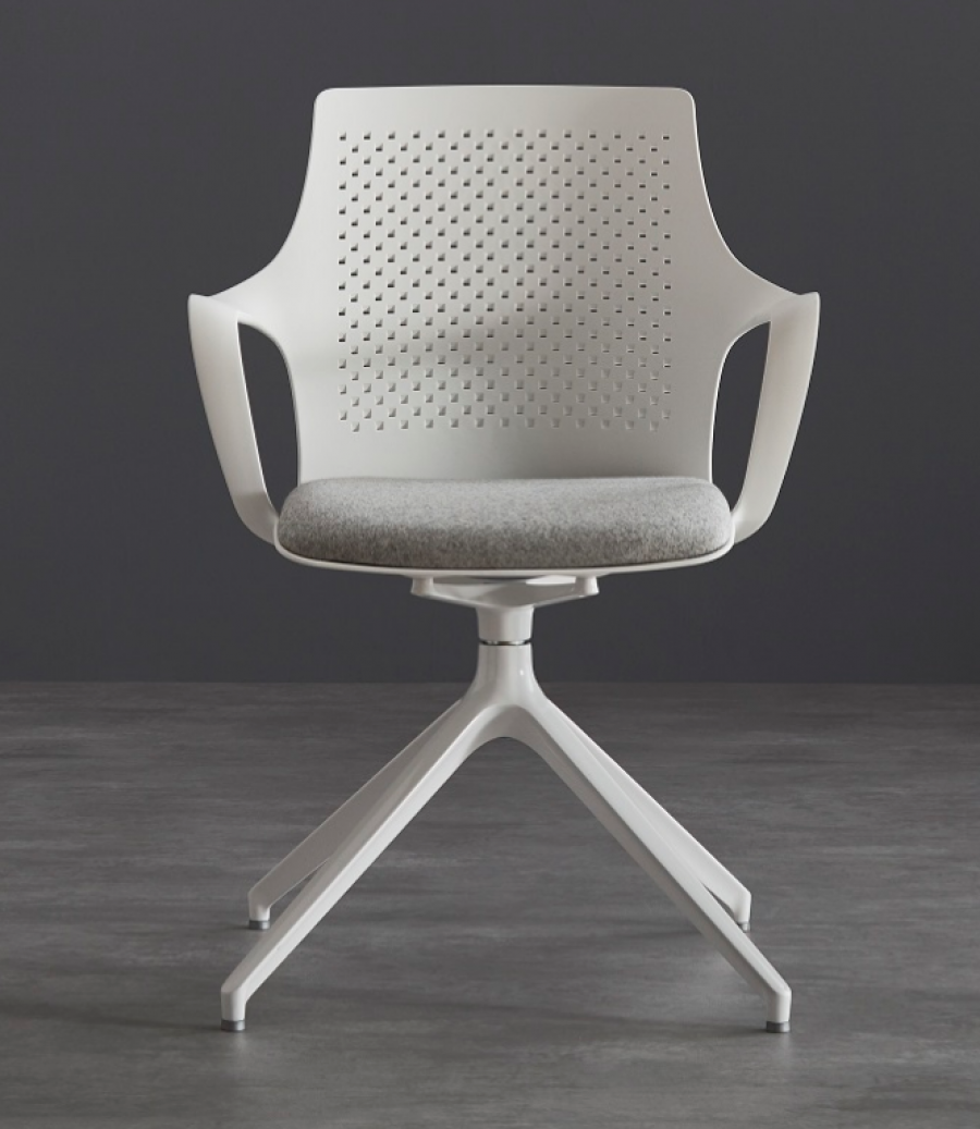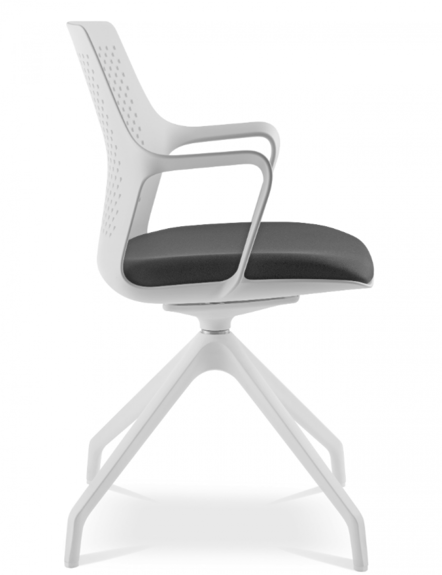 East Pyramid 4 Star On Glides Swivel Base / One Piece Moulded Polypropylene Shell / With Perforated Back / Available in Black, White or Grey Only / Integrated Arms / Generous Proportioned Seat for added Back Support / Fixed Seat Cushion with Various Choice of Fabrics / Fixed Height / Black or White 4 Star Swivel Base Standard / Upcharge for Polished Aluminum 4 Star Base / Ideal for Corporate Collaboration Areas, Hospitality Venues and Waiting Areas.