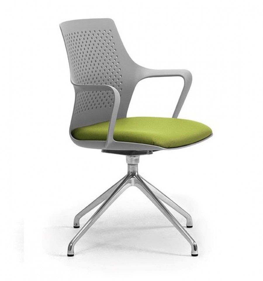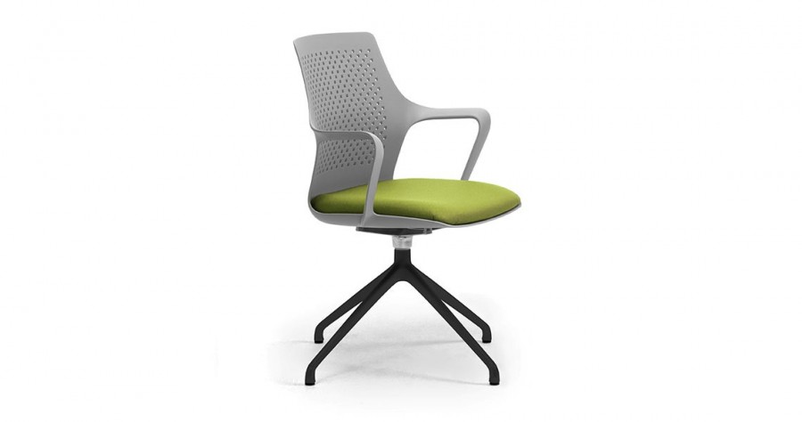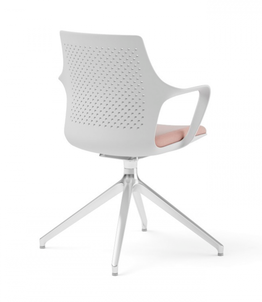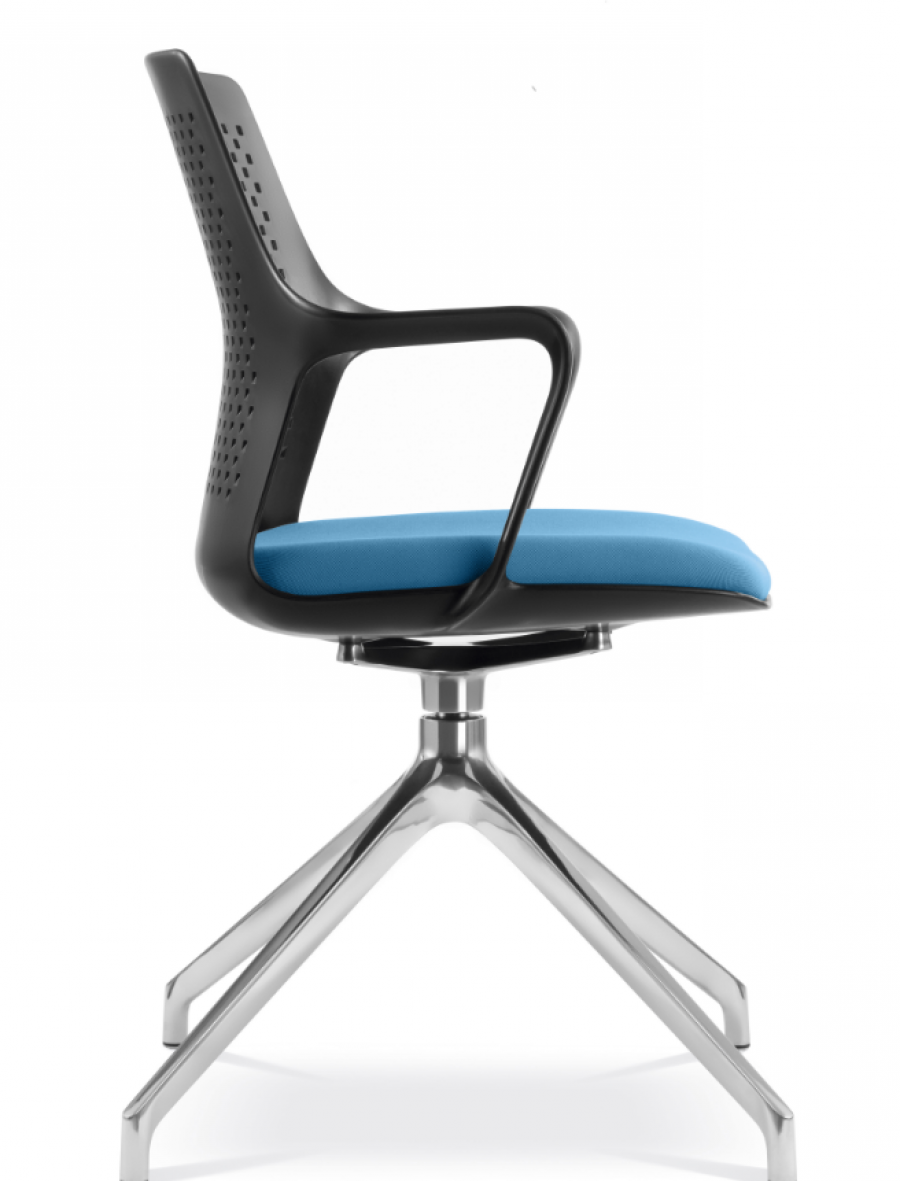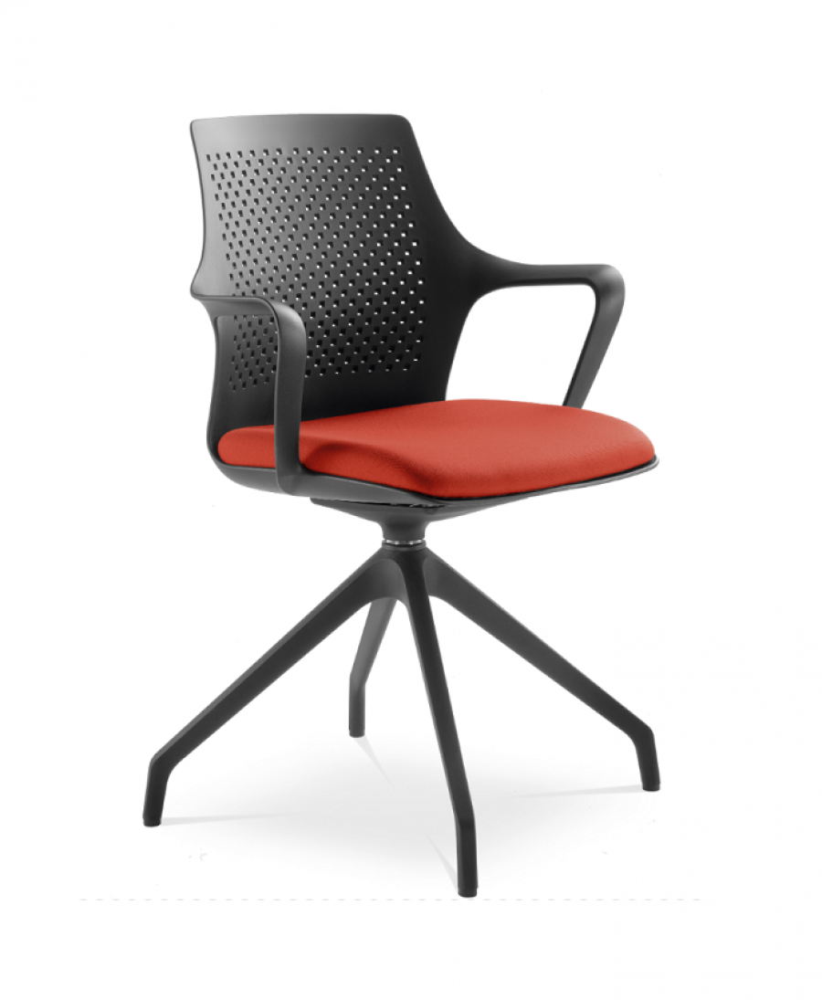 East Pyramid 4 Star On Glides Swivel Base / One Piece Moulded Polypropylene Shell / With Perforated Back / Available in Black, White or Grey Only / Integrated Arms / Generous Proportioned Seat for added Back Support / Fixed Seat Cushion with Various Choice of Fabrics / Fixed Height / Black or White 4 Star Swivel Base Standard / Upcharge for Polished Aluminum 4 Star Base / Ideal for Corporate Collaboration Areas, Hospitality Venues and Waiting Areas.