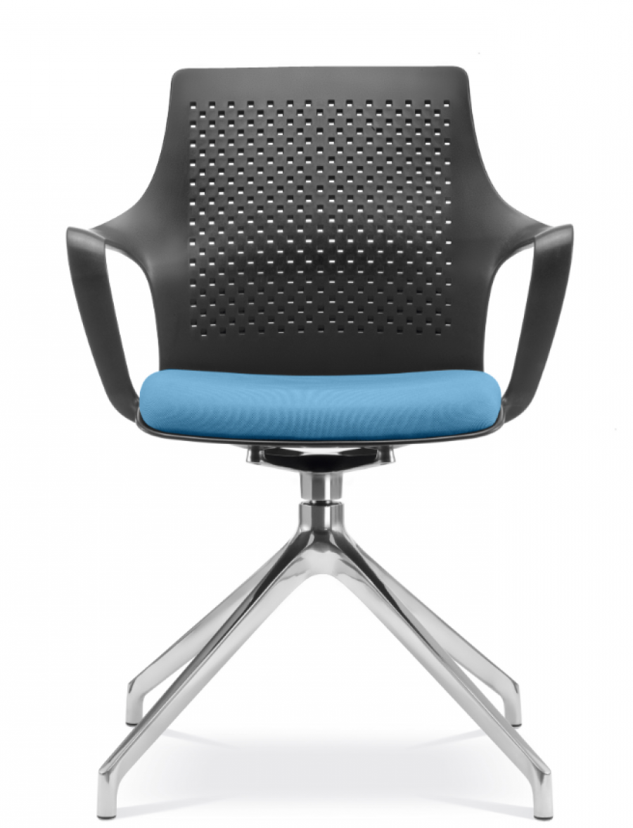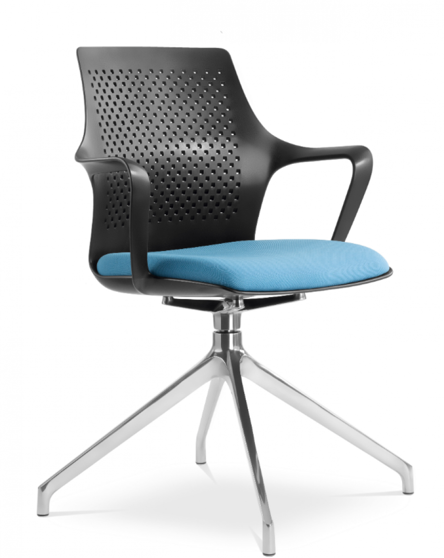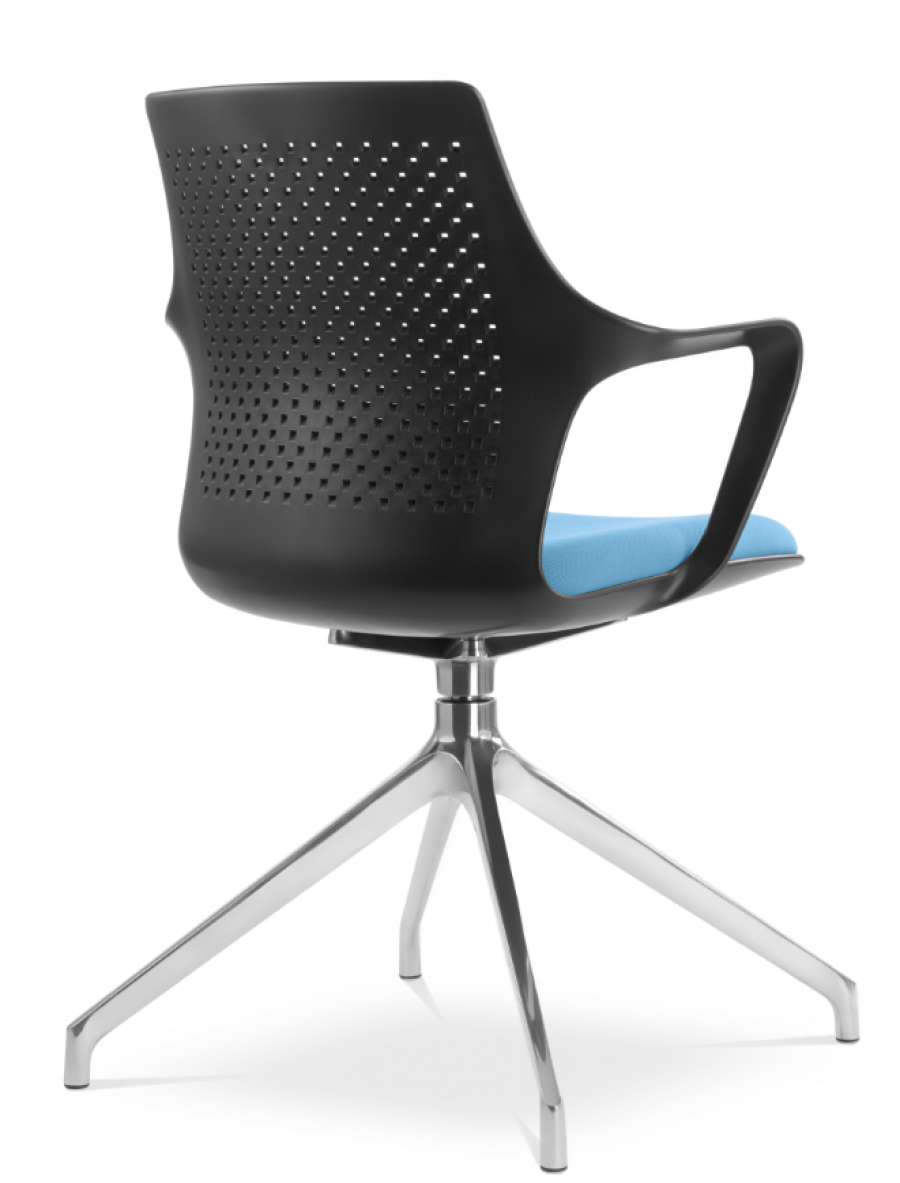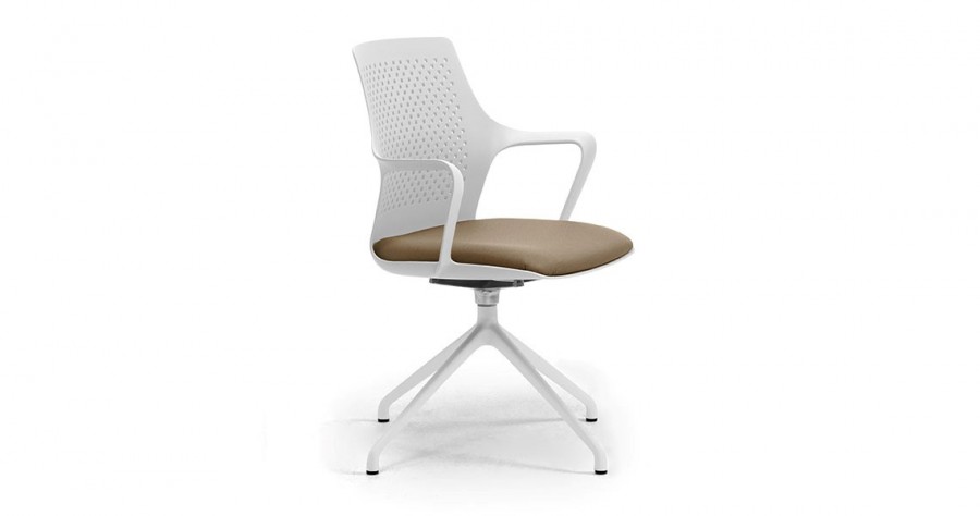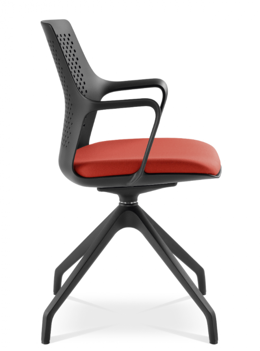 East Pyramid 4 Star On Glides Swivel Base / One Piece Moulded Polypropylene Shell / With Perforated Back / Available in Black, White or Grey Only / Integrated Arms / Generous Proportioned Seat for added Back Support / Fixed Seat Cushion with Various Choice of Fabrics / Fixed Height / Black or White 4 Star Swivel Base Standard / Upcharge for Polished Aluminum 4 Star Base / Ideal for Corporate Collaboration Areas, Hospitality Venues and Waiting Areas.