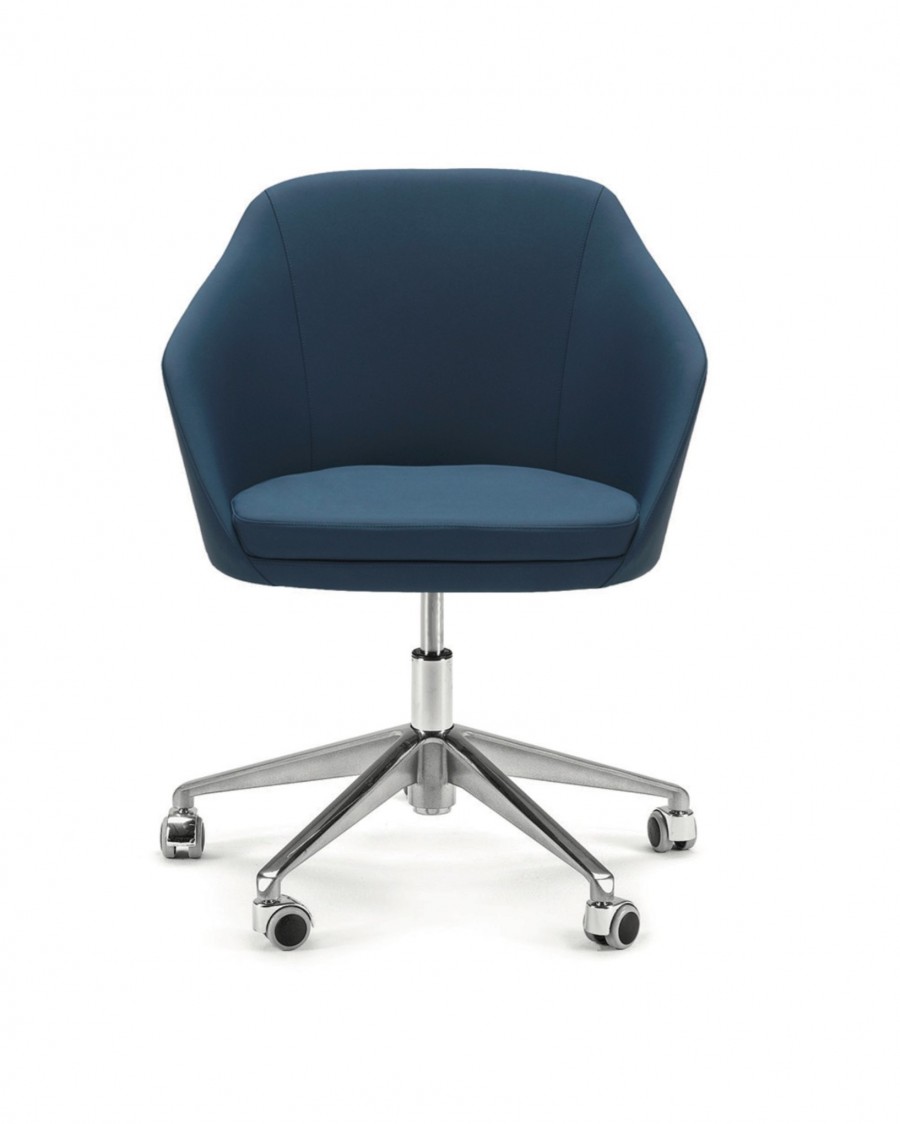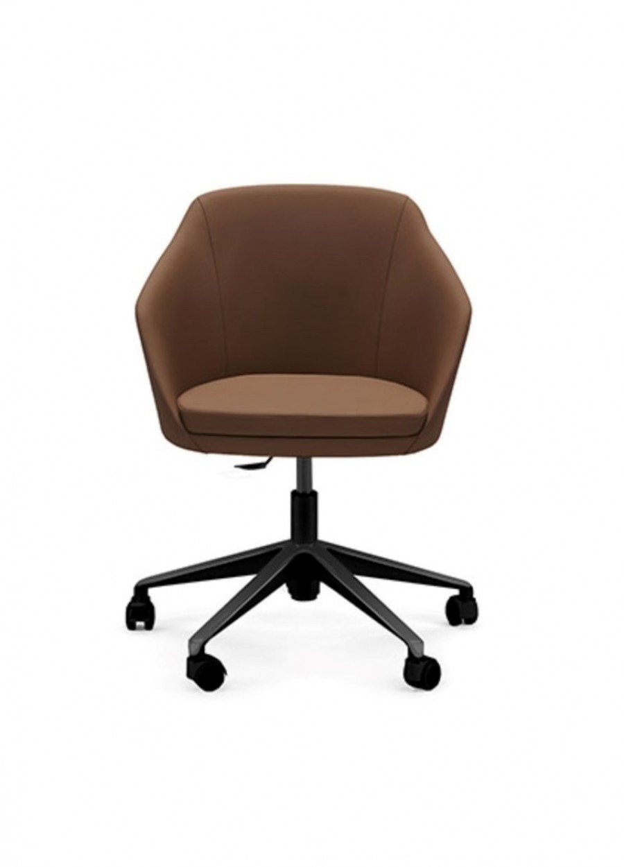 Olympia 5 Star base / Available in polished chrome or black painted / On castors / Swivel / Gas height adjustable / Moulded polyurethane shell / Fully upholstered / Generous seating proportions / Offers excellent back support with integrated arms / Thick seat cushion / Upcharge for two tone upholstery / Ideal for offices and hotel bedrooms.