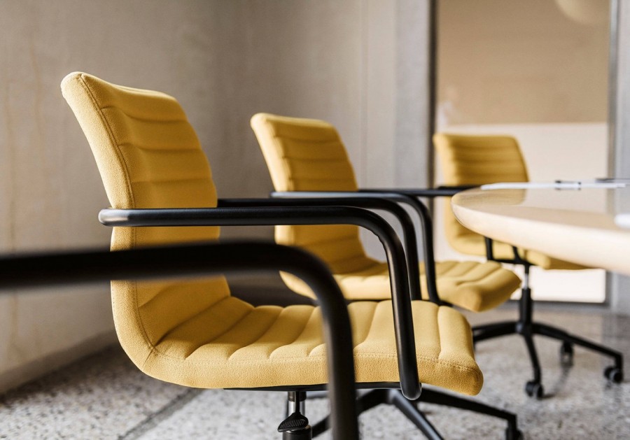 Pontiac Collection : Medium Back Chair / Plywood Shell / Fully Upholstered / Well Padded Seat and Back / Horizontal Stitch Lines for Added Detail / Integrated Round Tubular Arms / Black or White Finish Standard / Black or White Painted Aluminium Base / On Castors / Swivel / Gas Height Adjustable / Available in a Wide Choice of Fabrics Vinyl or Leather / Ideal for all Meeting Room Environments