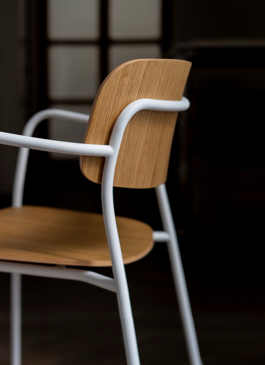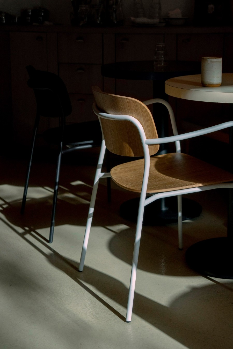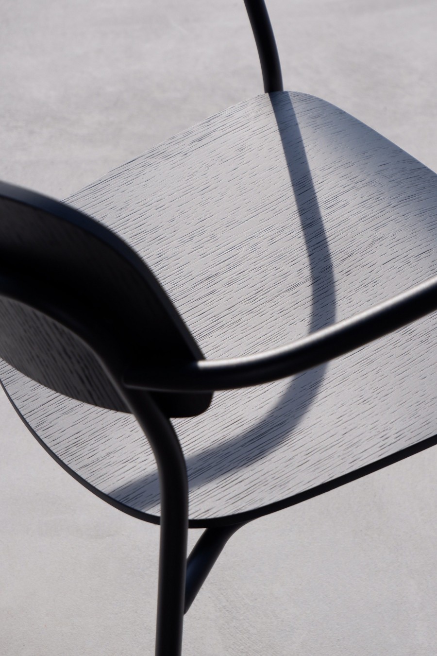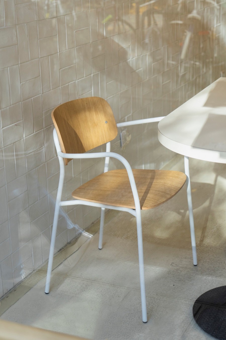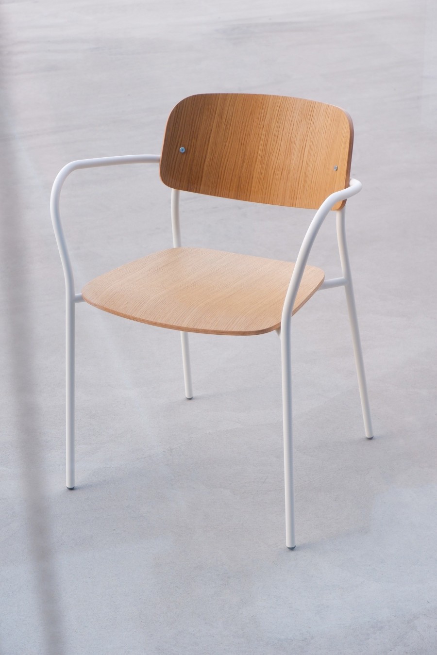 Zeru Multipurpose armchair / Plywood seat and back only in a choice of colour finishes / Round tube metal frame in a choice of painted colour finishes or upcharge for polished chrome / Integrated arms / On nylon glides / Lightweight design / Very robust for contract use / Stackable / Can be used in any public space area / Generous seating proportions / Ideal for educational use, the workplace, cafes, restaurants and conference centres.