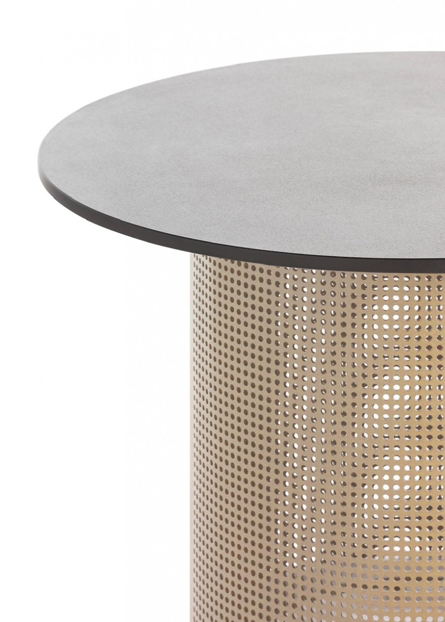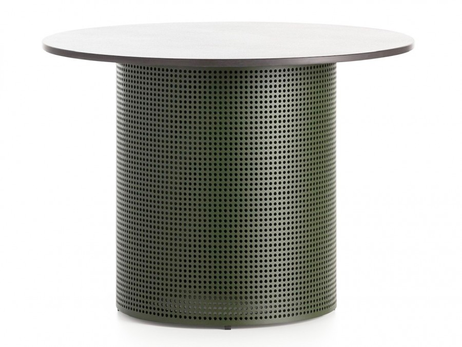 Luxe Round Cocktail Table / Aluminum perforated sheet metal base, well weighted / Frame colour finish available in 16 colour options including satin gold to suit any outdoor environment / HPL laminate top in black or white standard (other colours on request) / To be used in conjunction with all other Luxe seating products / Ideal for all terraced areas, large open lounge areas.