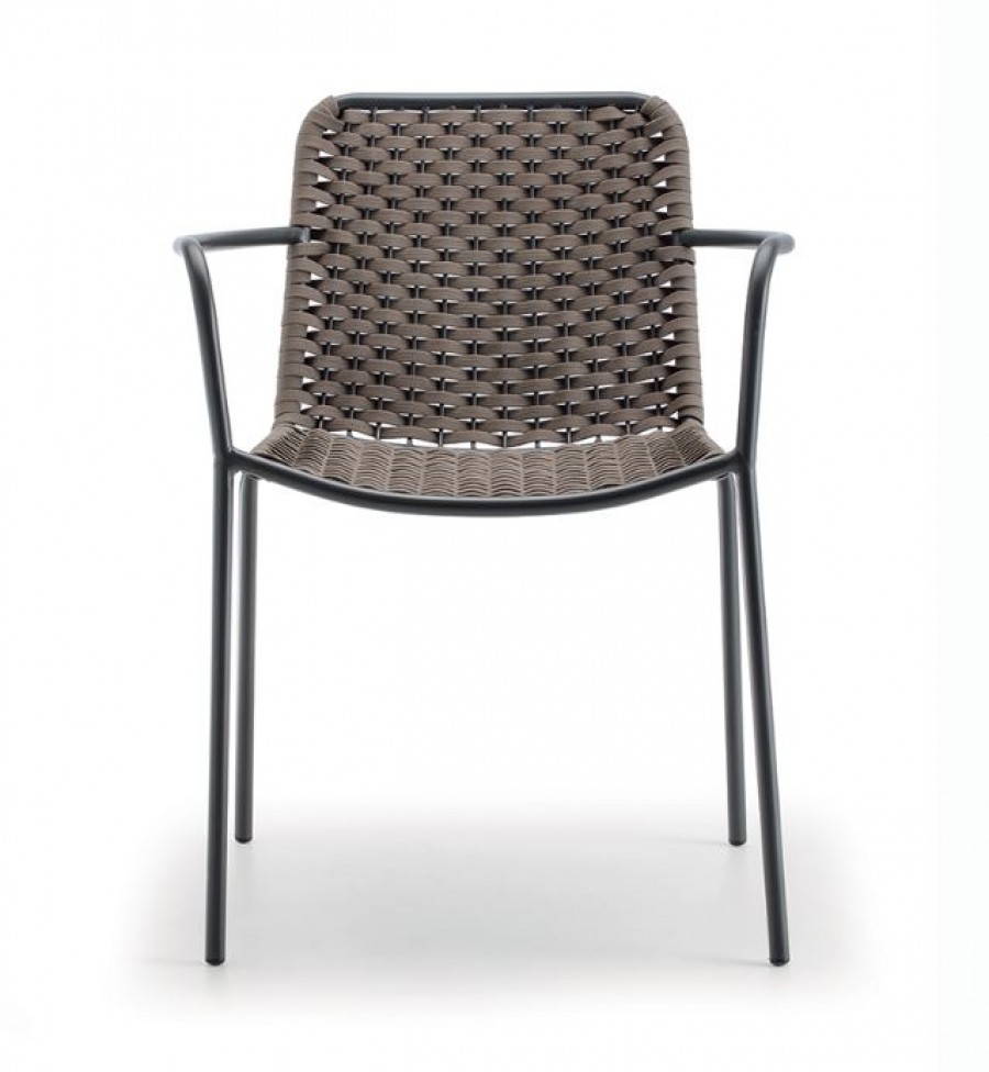 Toro Arm Chair / Round Tube Metal Frame with Integrated Arms / Black Painted Frame Finish Standard / Stackable / Taupe Shell Only / Polyurethane Woven Shell / Can Be Used Indoor And Outdoor / Ideal for all Hotels, Restaurants and Hospitality Environments