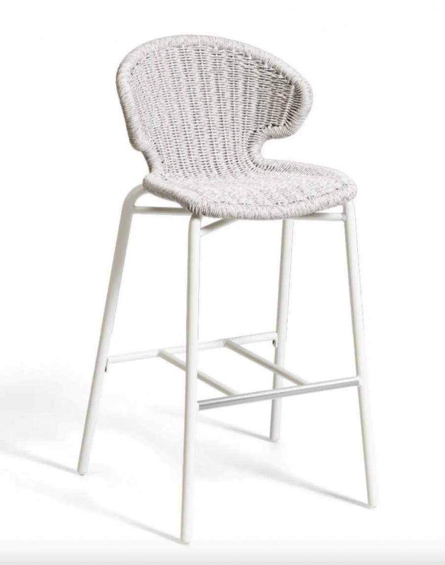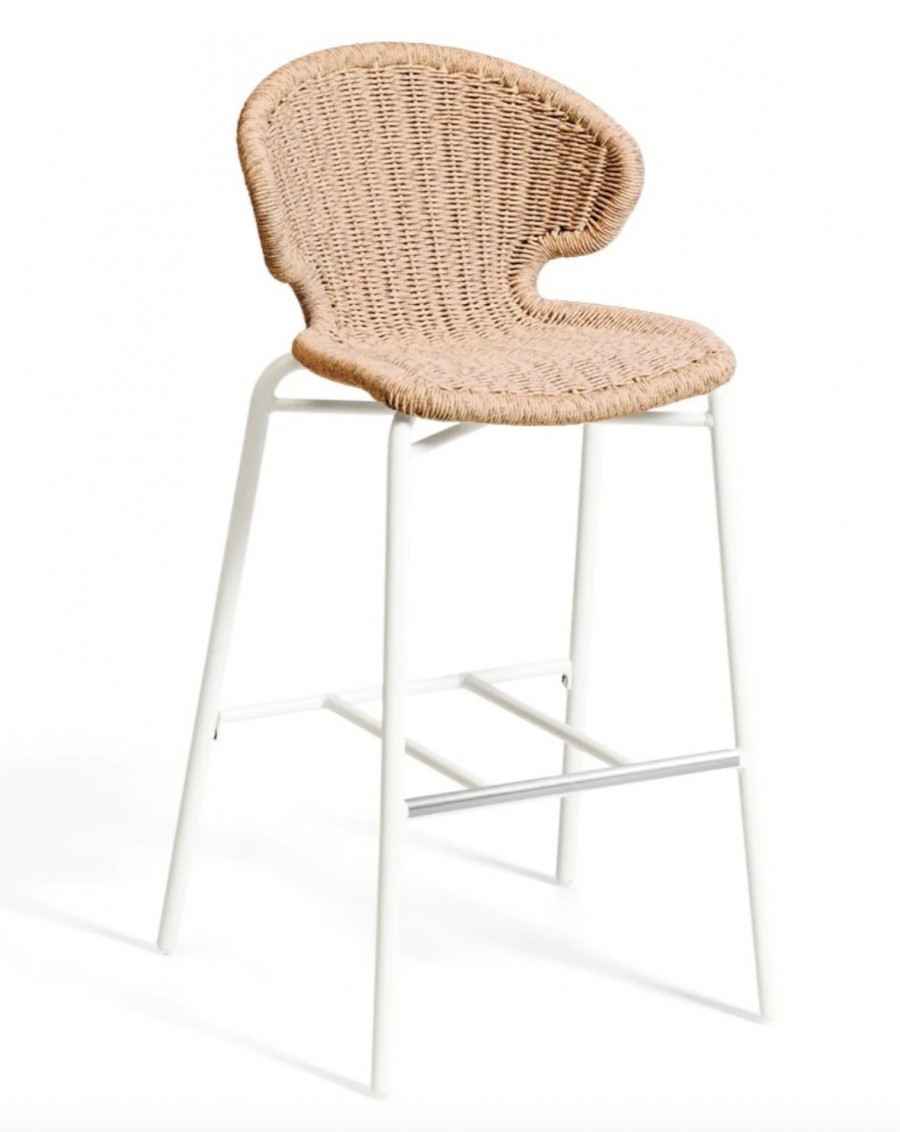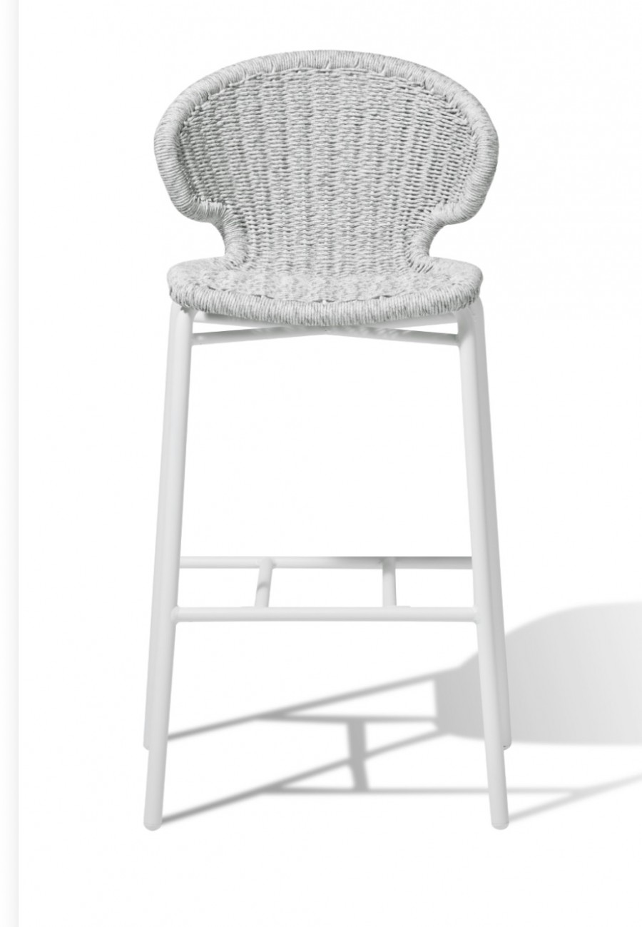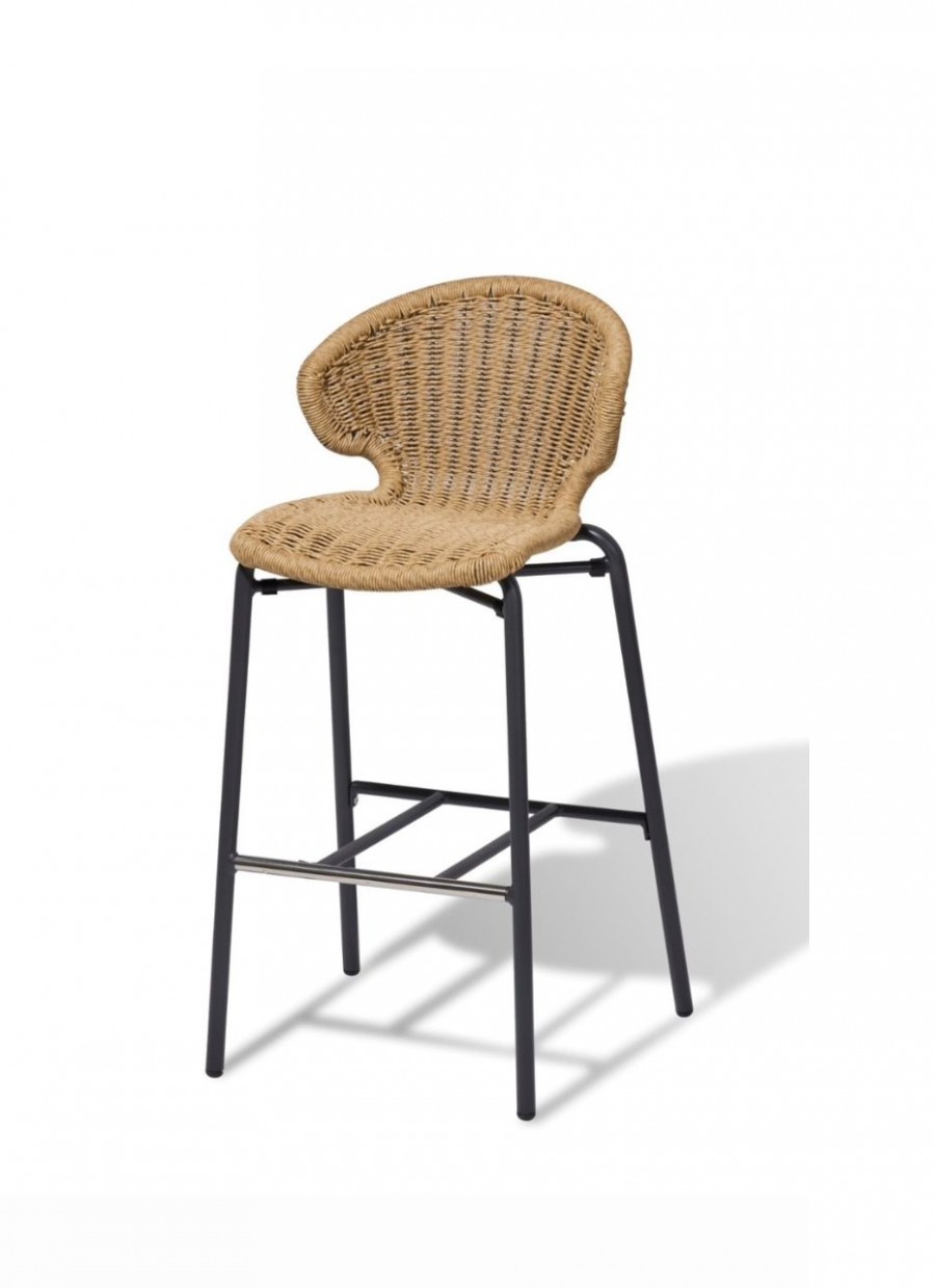 Amor Outdoor Counter & Bar Stools / Wicker shell / In various color options including natural with black or white aluminium frame, anthracite with black frame, white with white frame or green with black frame / Round tubular aluminium frame / Braced under seat for contract use and detail / Integrated foot rest / On nylon glides /Curved back for added comfort / Ideal for all outdoor dining applications including restaurants, hotels and country clubs. Minimum order quantity of 50 of any combination.