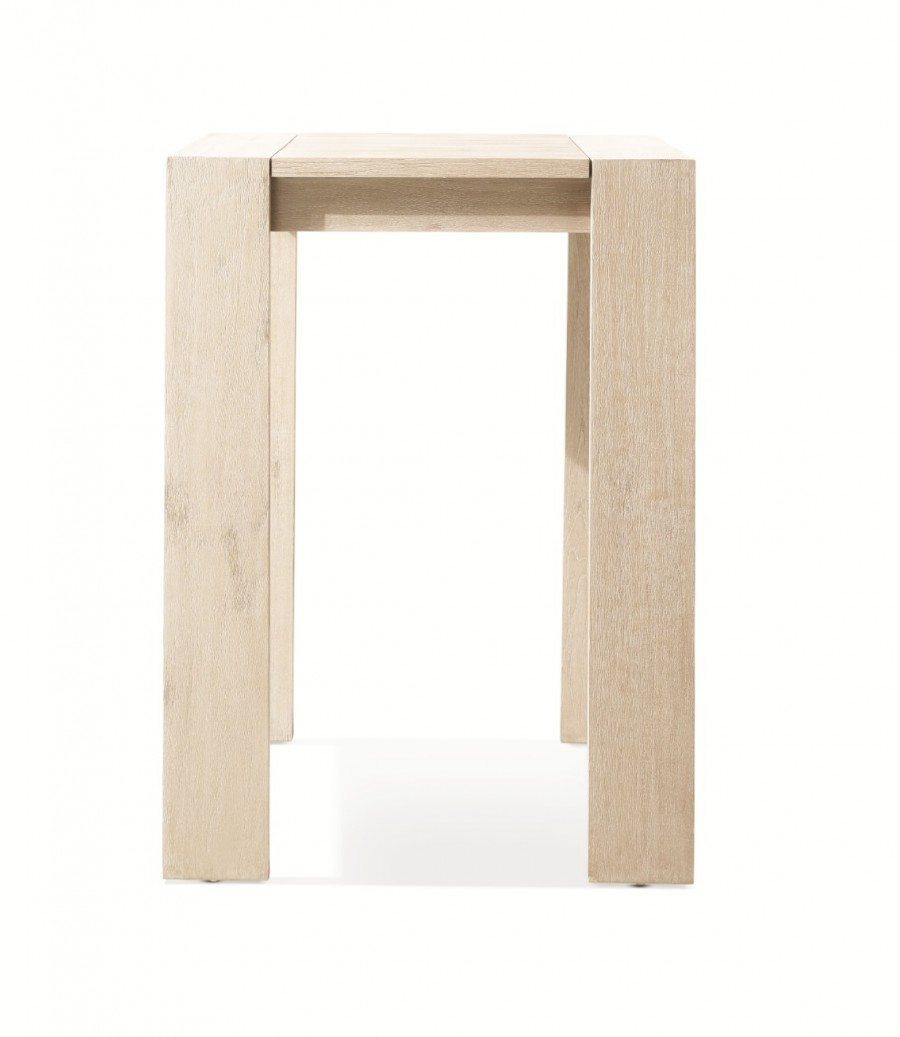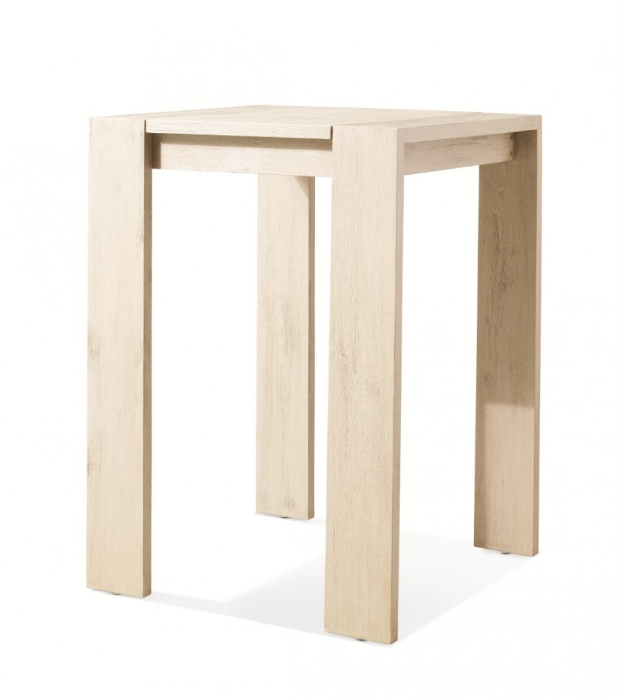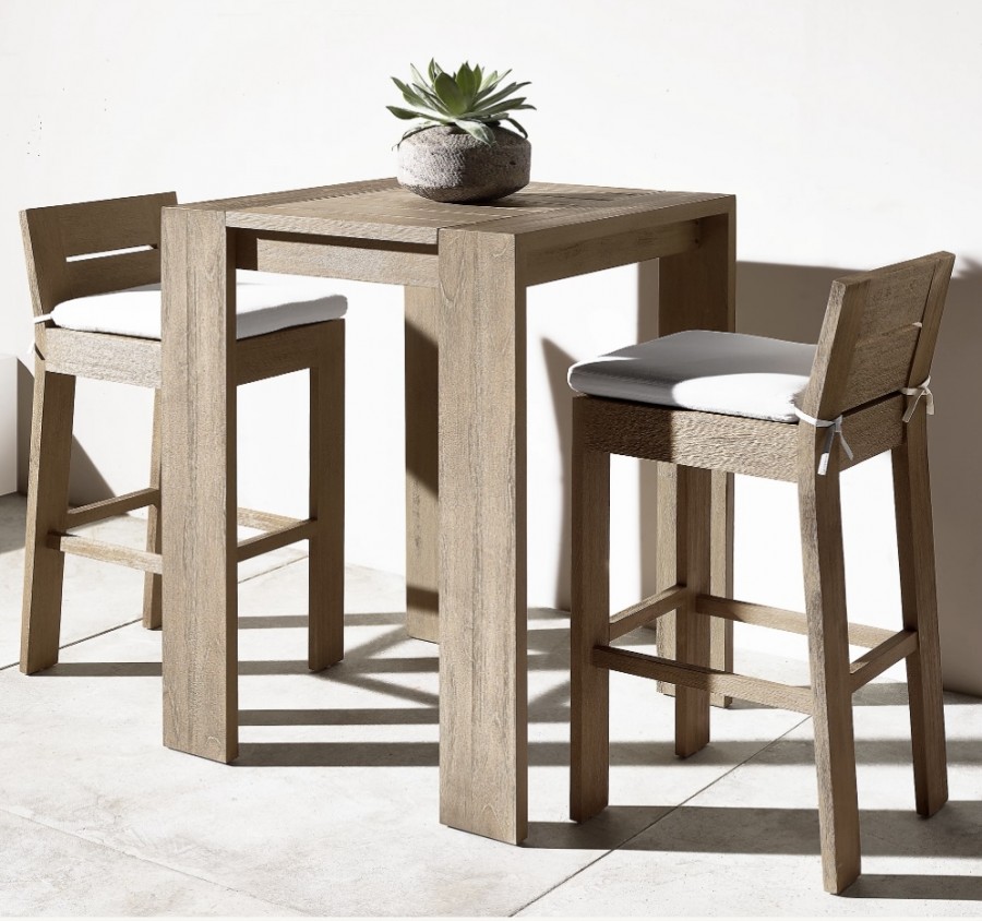 Astra Bar Table / Solid hand crafted premium, sustainable real teak frame for heavy contract use all year round outdoors / Well weighted frame / Available in weathered teak or natural teak / On nylon glides / Slatted top for added detail / Upcharge for outdoor covers / Ideal for all high-end outdoor bar areas for hotels and restaurants, country clubs and retail.